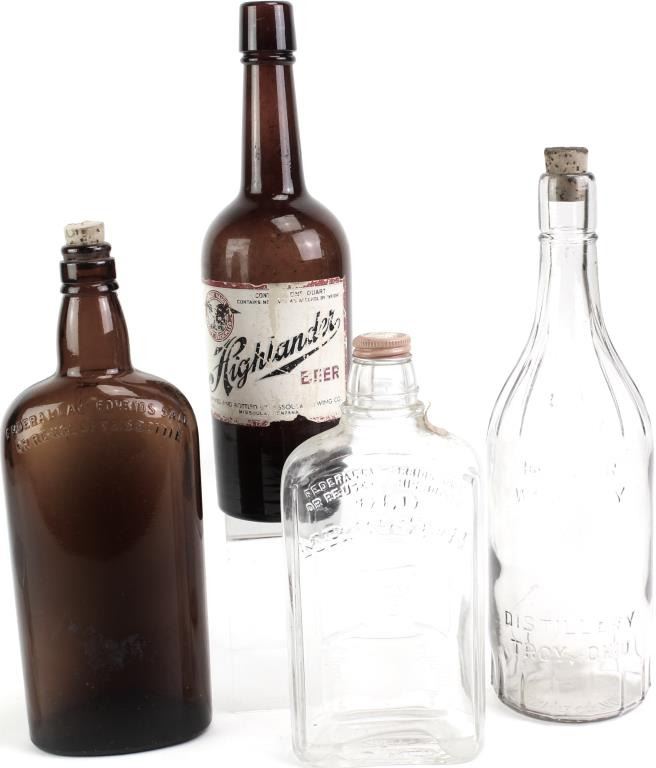 Collection of 4 antique whiskey and beer bottles includes Highlander Beer Missoula Montana with paper label.includes Highlander Beer Missoula Montana with paper label.