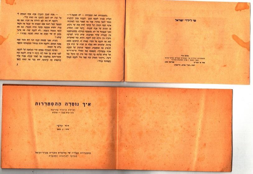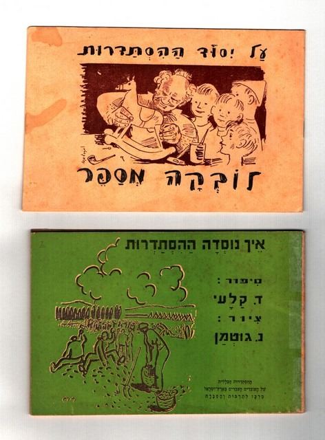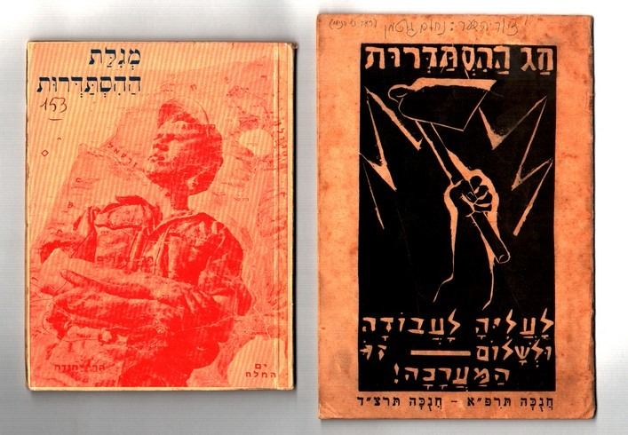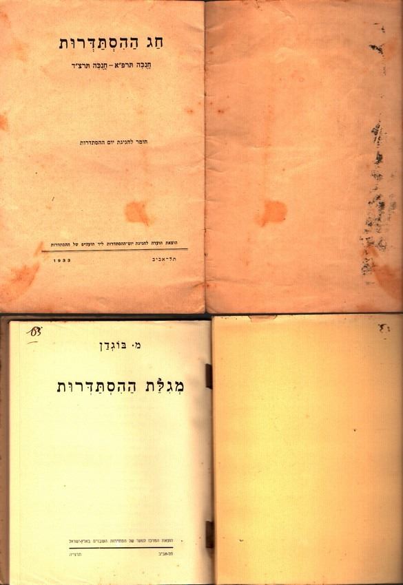 Collection of 4 booklets of the Hebrew Workers' Histadrut in the Land of Israel, 3 are ilustrated by Nahum Gutman, includes: 1. The Histadrut Holiday, Hanukkah 1921-Hanukkah 1933: material for the Histadrut Holiday festivities, published by the Committee for the Histadrut Day Celebrations, Tel Aviv, 1933, with a hand swinging a hoe on the cover, illustrated by Nahum Gutman, reasonable-good condition: foxing, handwritting in pen on the reverse, yellowing pages. 2. On the Essence of the Histadrut - Lubka recounts, gift to the children of Israel, Davar Print, February 1959, cover illustrated by Nahum Gutman, good condition: slightly yellowing, 2 stains on the cover 3. How the Histadrut was Founded: the founding committee in Haifa, Kislev 1921, written by D. Kalai, illustrated by Nahum Gutman, published by the Hasbara Center of the Hebrew Workers' Histadrut in the Land of Israel, fourth edition: 1952. Reasonable-good condition: reasonably yellowing, back cover has been repaired 4. Megillat Hahistadrut by M. Bogdan, published by the Youth Center of the Workers' Histadrut in the Land of Israel, Tel Aviv, 1935, good condition: first pages slightly loose.