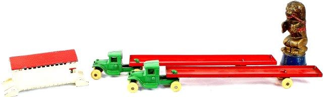 Mack Auto carriers 14" long and Lion and covered bridge banks. Est. 100-200