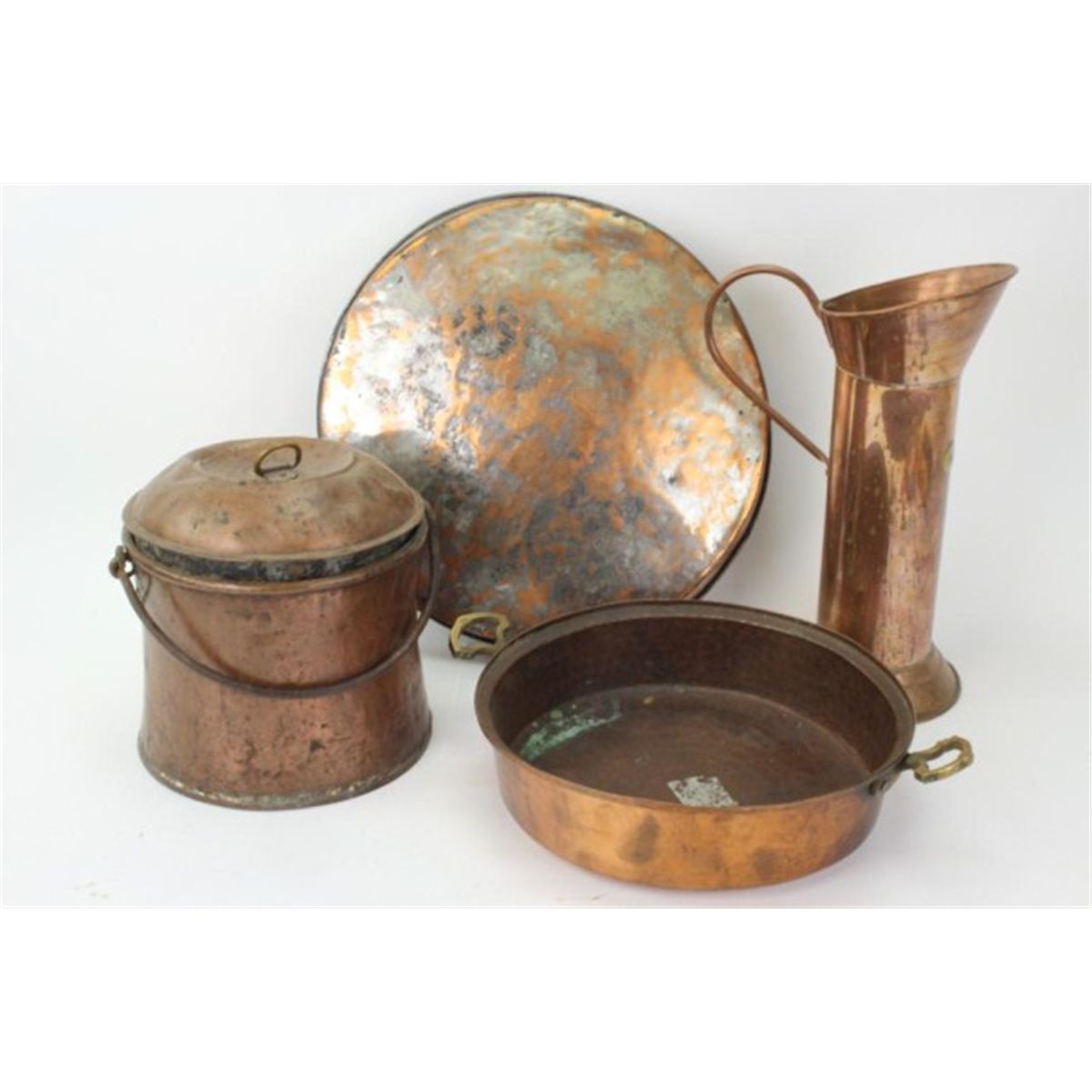 Collection of 4 copper vessels includes early hand made lidded copper bucket with original lid and iron forged handle, 10" tall, 2 antique circular pans and a later copper pitcher.