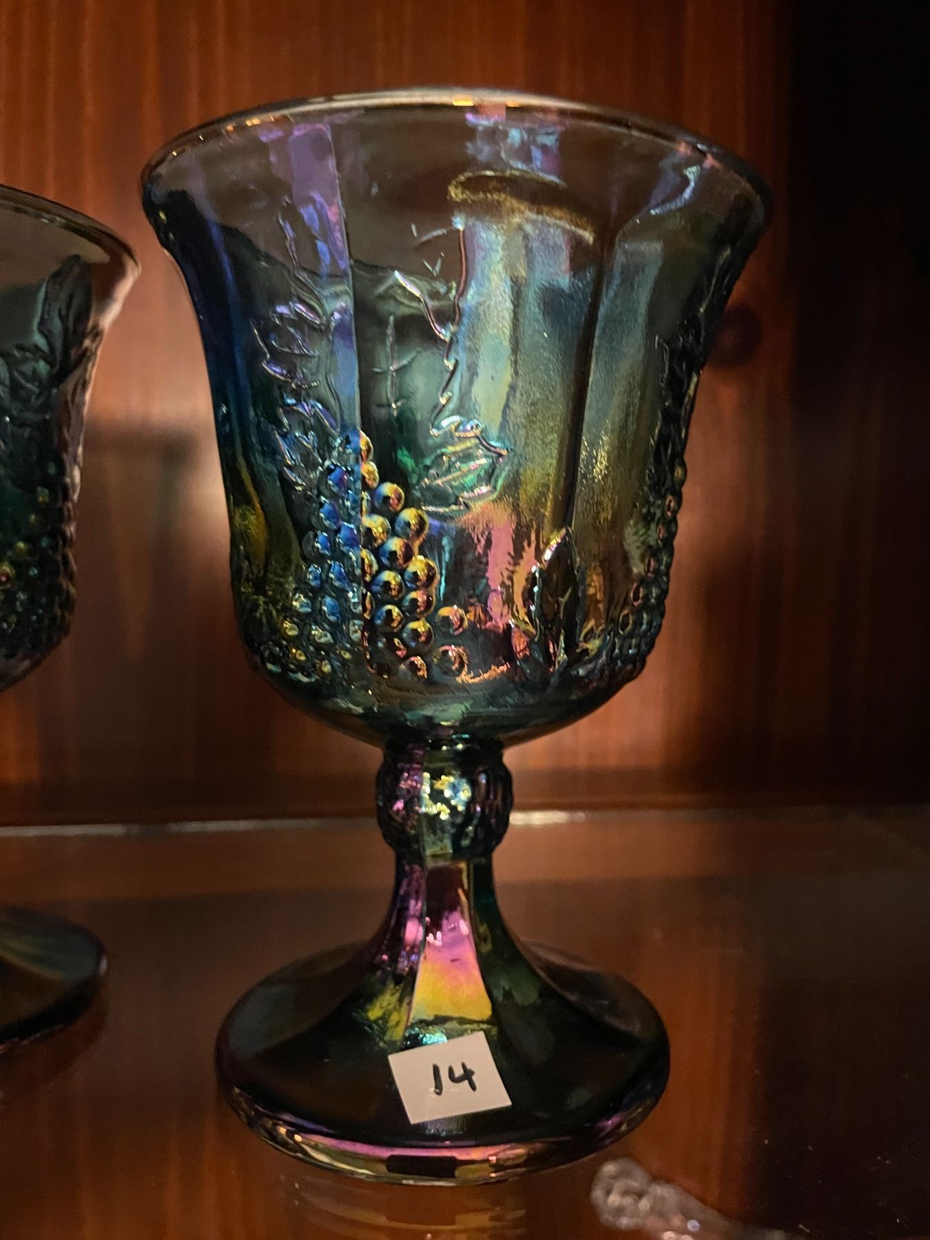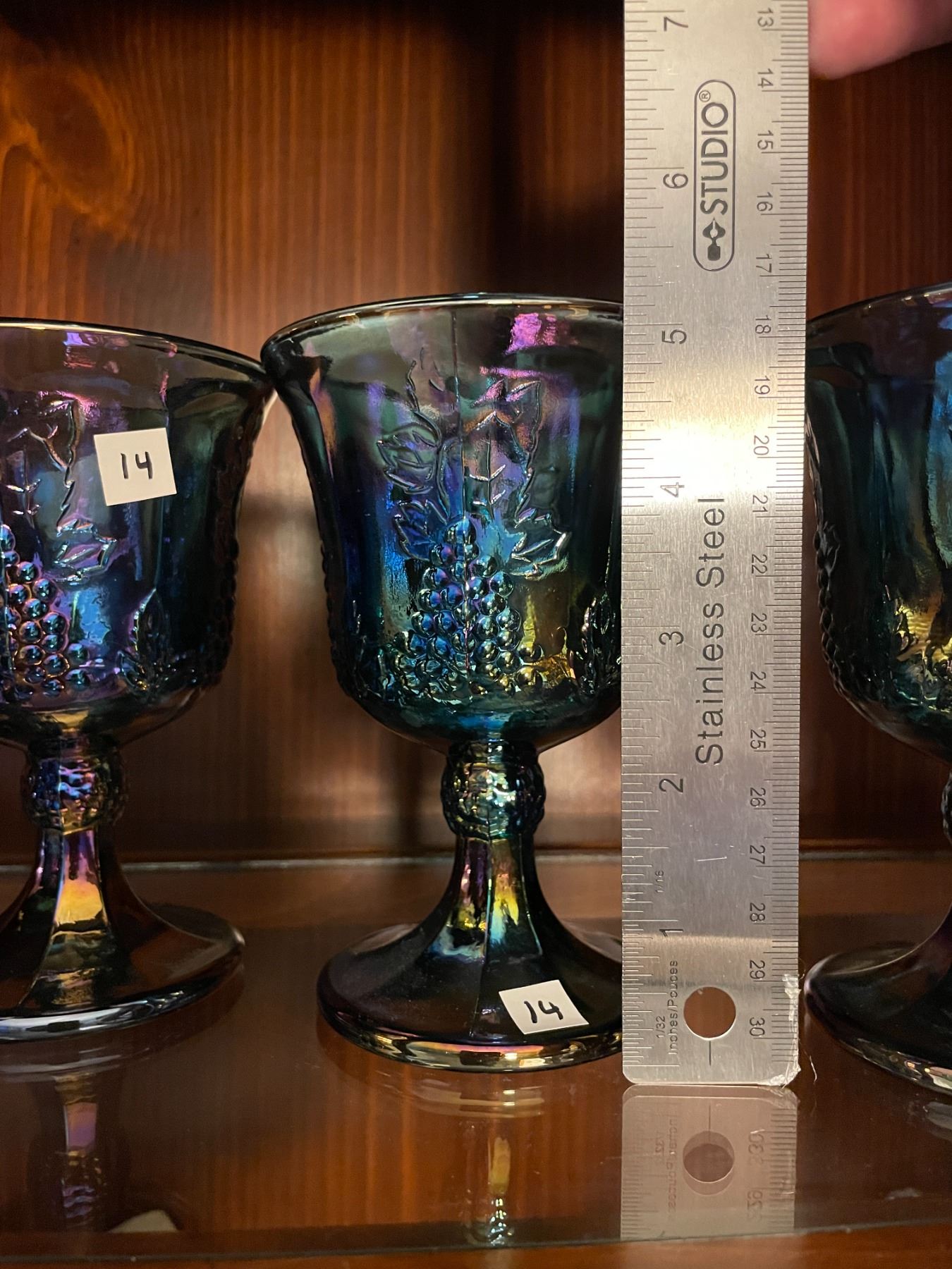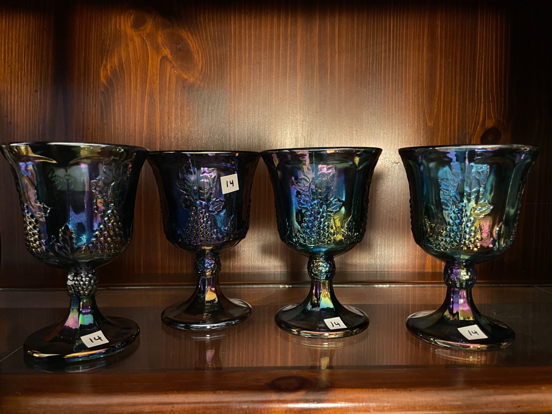 Collection of 4, harvest grape pattern, blue, carnival glass, goblets