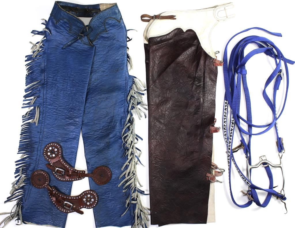 Collection of 4 includes 2) pair rodeo chaps, bridle, unmarked 2 piece leather spur straps.bridle, unmarked 2 piece leather spur straps.