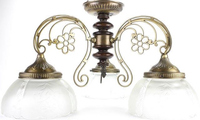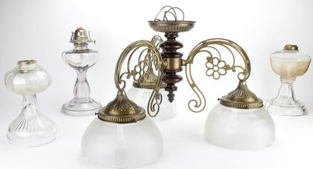 lamp bases all very good condition and a vintage free arm electric ceiling fixture with frosted globes. Frawley Estate Item. Est. 75-150