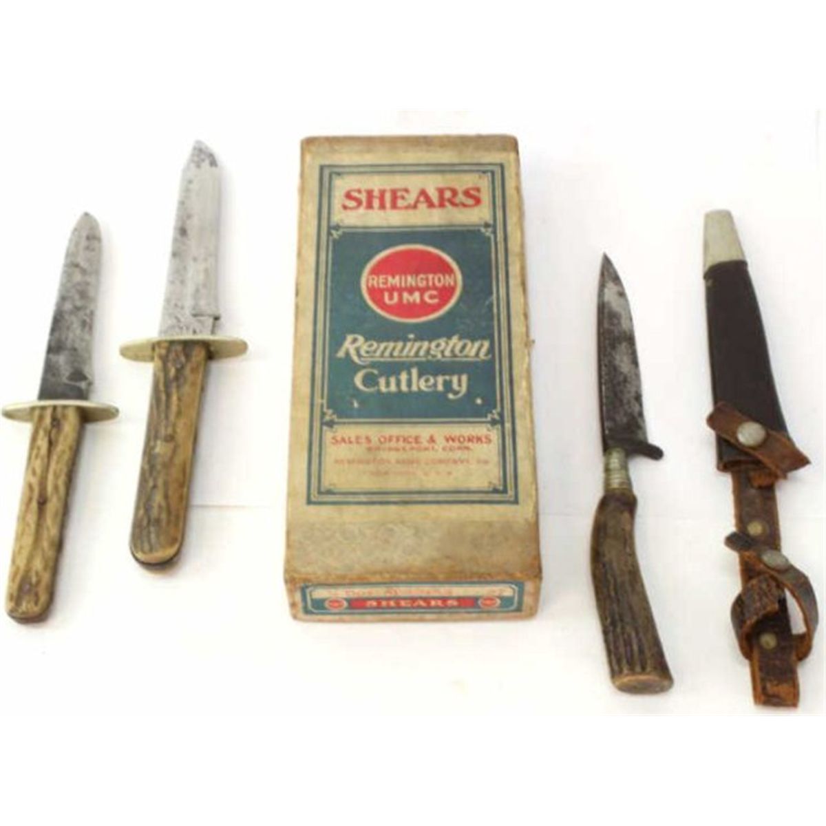 Collection of 4 includes 3 knives and 1 box including a stag handle spear point marked Henne on the 4 " blade with original leather sheath, stag handled knife with 4 1/2" blade marked John Newton on the ricasso, stag handled knife with 4" blade marked