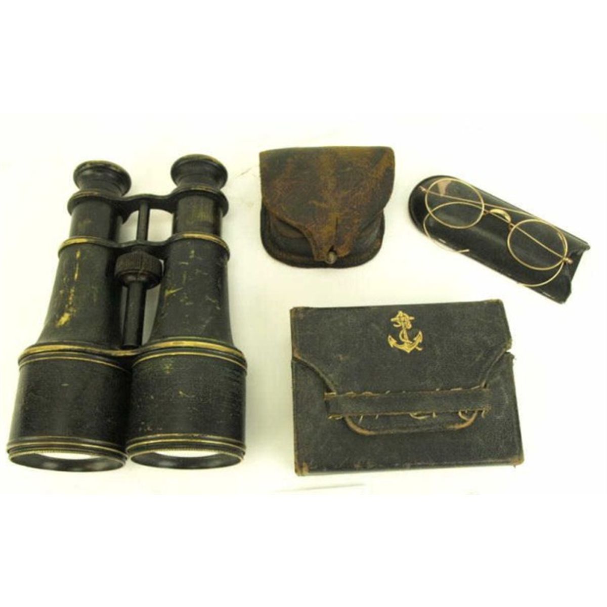 Collection of 4 includes Antique pair of wire framed glasses with leather sheath, early leather flap pouch, navy sowing kit in black leather case and an antique pair of binoculars with marked Ranchemans Glass.