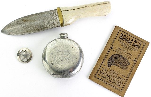 knife 10" overall, pewter Holland and Holland screw top flask, reproduction Texas Ranger badge, and old Hallams Trappers Guide dated 1915. Est. 100-175