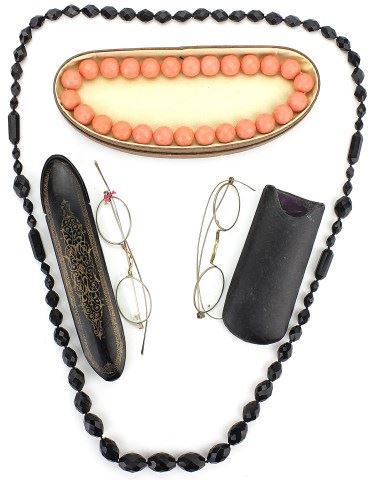 or French Jet Victorian mourning necklace, 20" long. Pair of cased antique spectacles and plastic costume necklace in original box. Frawley Estate items. Est. 75-150
