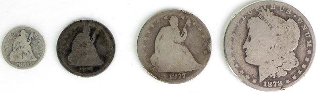 1875 dime, 1877? quarter, 1877 CC half dollar, and 1878 CC morgan silver dollar. Est. 125-200