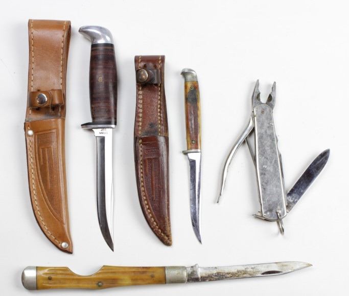Collection of 4 knives includes 2) hunting knives, multi tool and folding blade.knives, multi tool and folding blade.