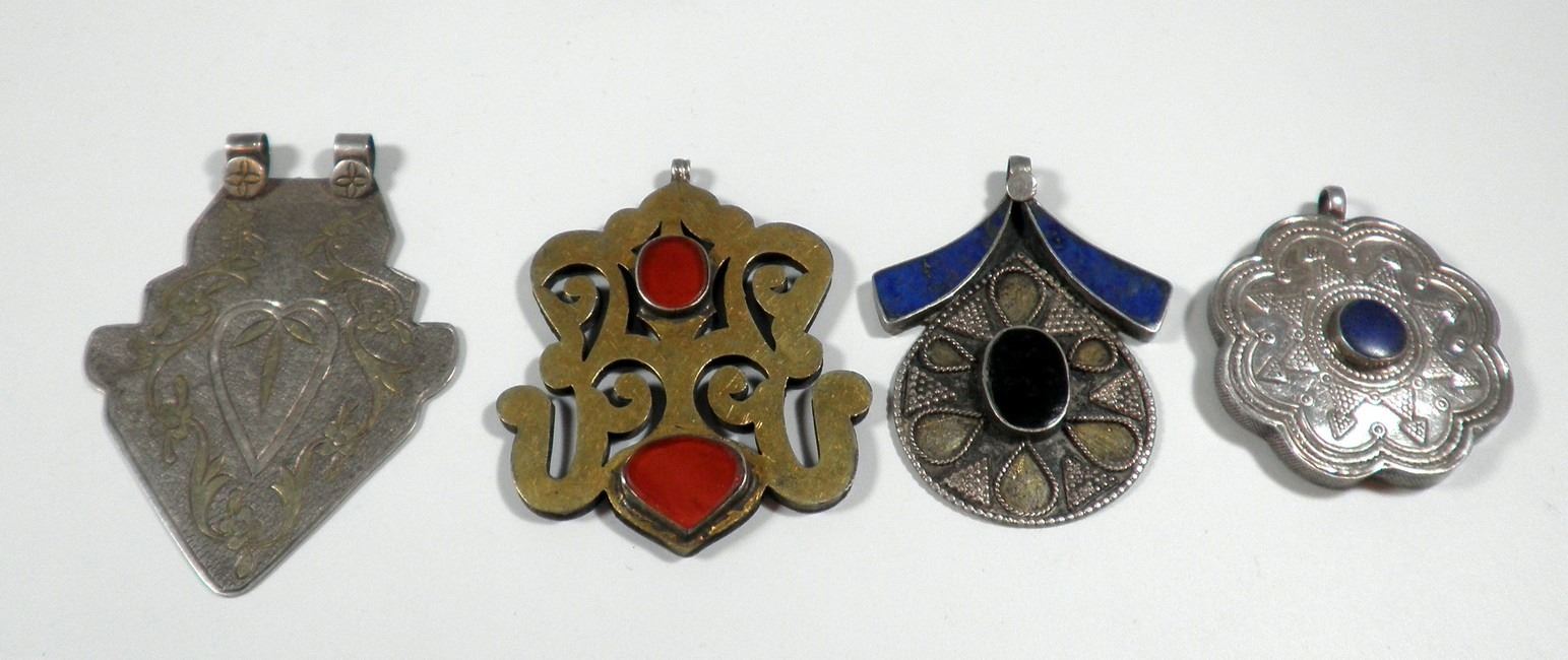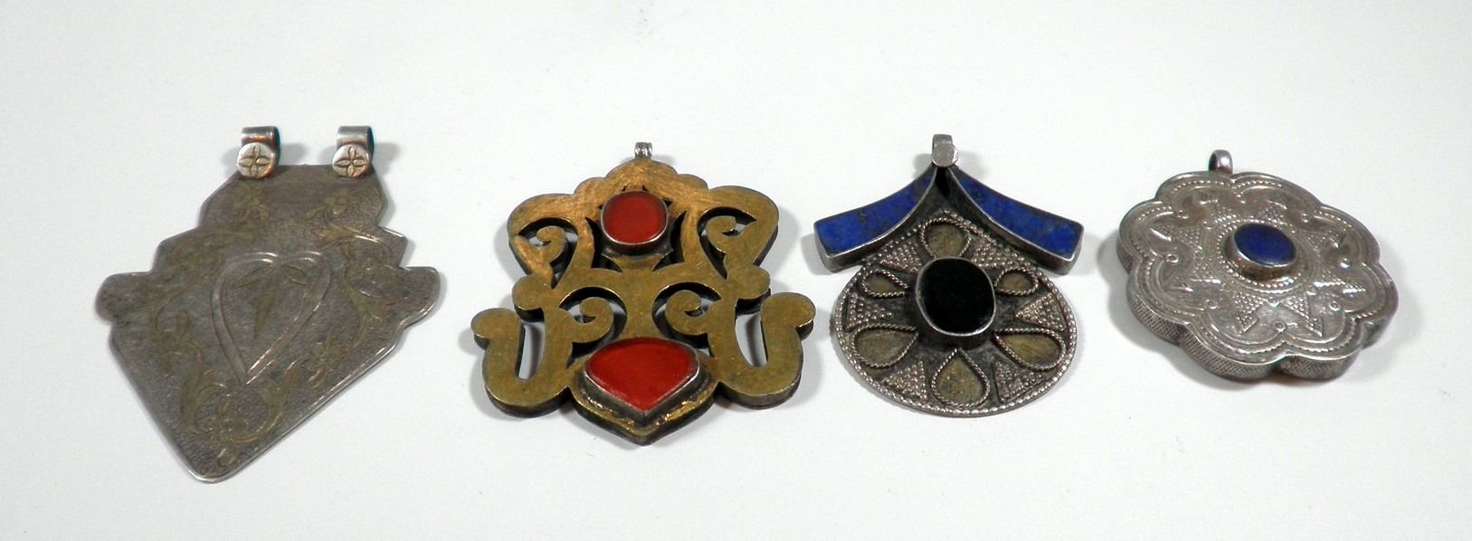 Collection of 4 (low) silver Turkmen pendants: 2 pendants with lapis settings, one combines brass pieces with agate settings and flower and plant carvings, total weight: 54 gm, length: 4.5-7 cm.