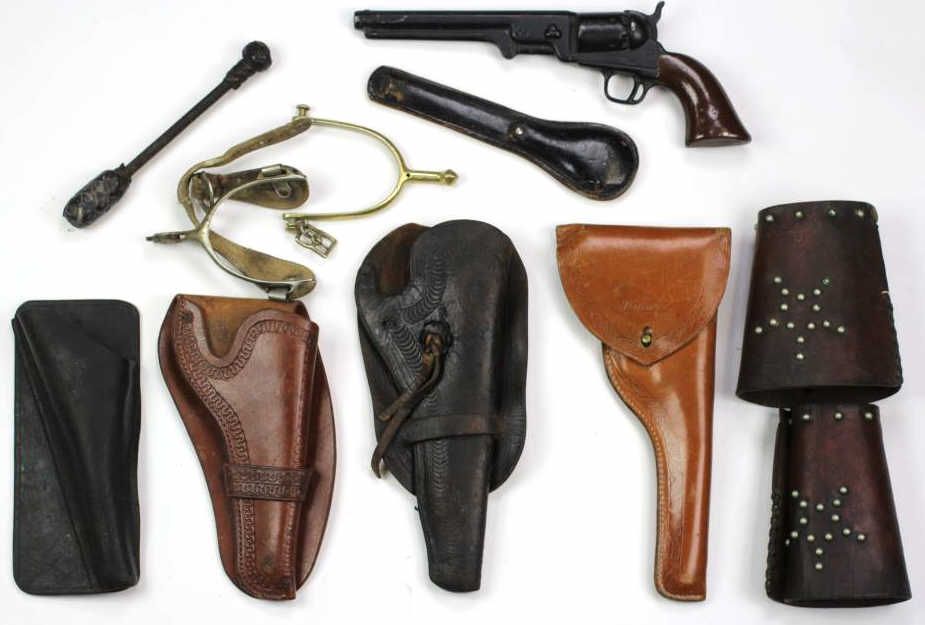 Collection of 4 misc holsters, 1 pair cowboy cuffs, 2 single spurs, metal cast 1851 prop gun, and 2 leather saps.