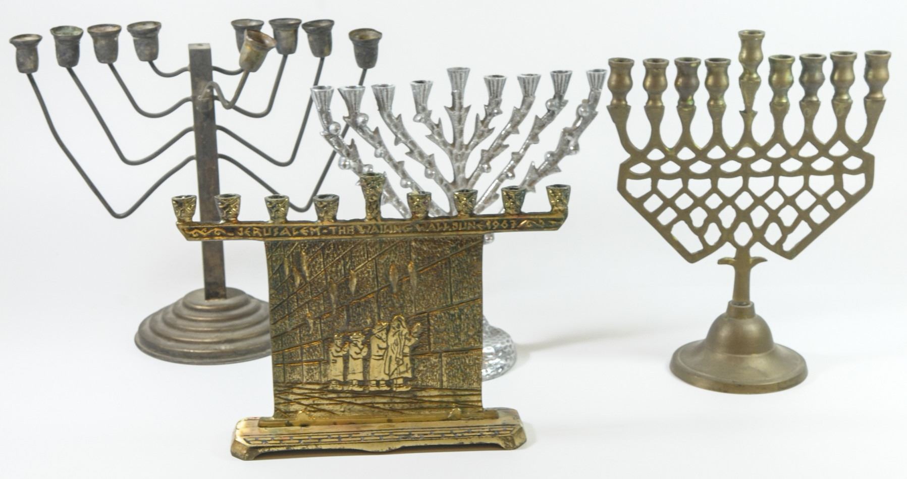 Collection of 4 old Israeli Hanukkah menorah lamps: 1. Unpright brass menorah with relief of people praying at the Western Wall 2. Aluminum tree-shaped menorah, 3. Antique-style East European brass menorah 4. Art Deco-style silver-plated brass menorah, presumably missing a decoration. Reasonable wear to patinas. Height: 15-23 cm.