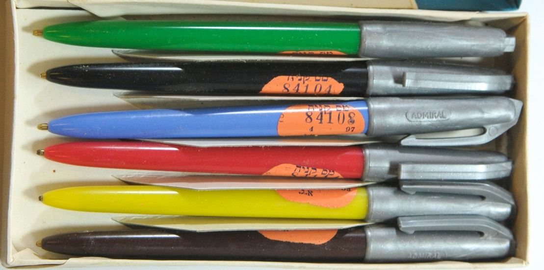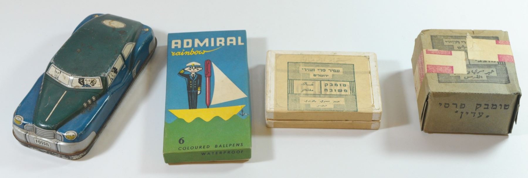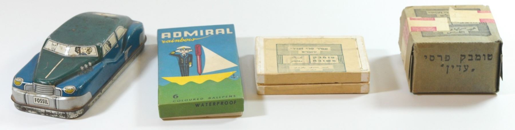 Collection of 4 old items: 1. Tin car-shaped box-pencil box, made in Hong Kong, reasonably worn, length: 14.5 cm. 2. Set of 6 colorful ballpens by Admiral, in original case, very good condition, length of case: 13 cm, 2. (Full!) Tobacco box made by Amir Sari and Aziri Jerusalem, fine tobacco 4. Tobacco box made by Amir Sari and Aziri Jerusalem, has never been opened.
