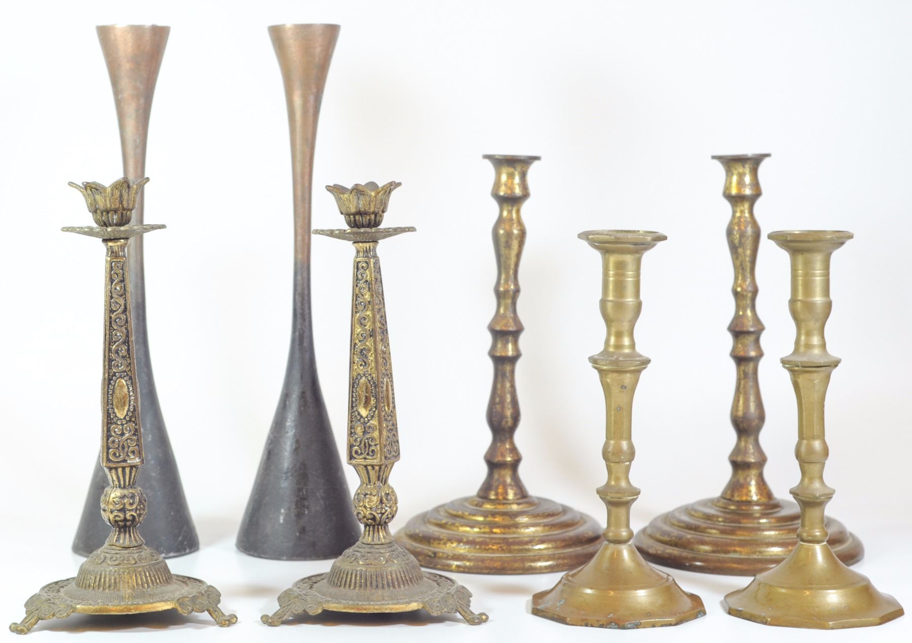Collection of 4 pairs of old Israeli Shabbat candlesticks: 1. Modern design, designed by Michael Aram, alloy, 2. Candlesticks by Weinberg, circa 1950s-1960s, brass, with classic embellishments, flaw to one of the holders 3. Pair of heavy bronze candlesticks 4. Brass candlesticks, Eastern-European design, height: 21-32 cm.