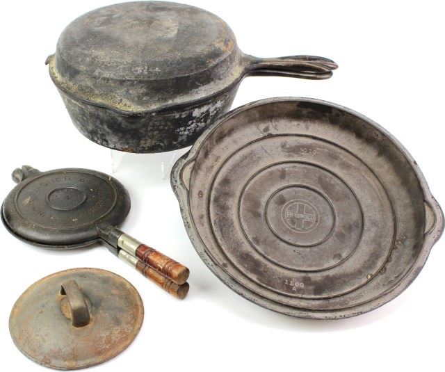 Wagner waffle iron, unmarked double fry pan, 1 Griswold marked No. 10 lig and one unmarked lid. Est. 75-150