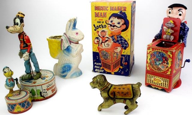 including Music Maker Man in box, 1944 Walt Disney Donald Duck Duet, duck missing one arm.  Est. 150-250