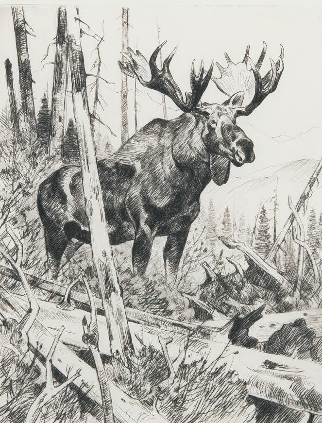 In 1925 Carl Rungius created 12 etchings and drypoints. Over the following 20 years he completed 34 additional etchings and drypoints ending with Alaskan Moose in 1945. The complete set is documented in Carl Rungius: The complete prints, A Catalogue Raisonne, Donald E. Crouch, Mountain Press Publishing Co., Missoula, MT, 1989, 203 pages.
