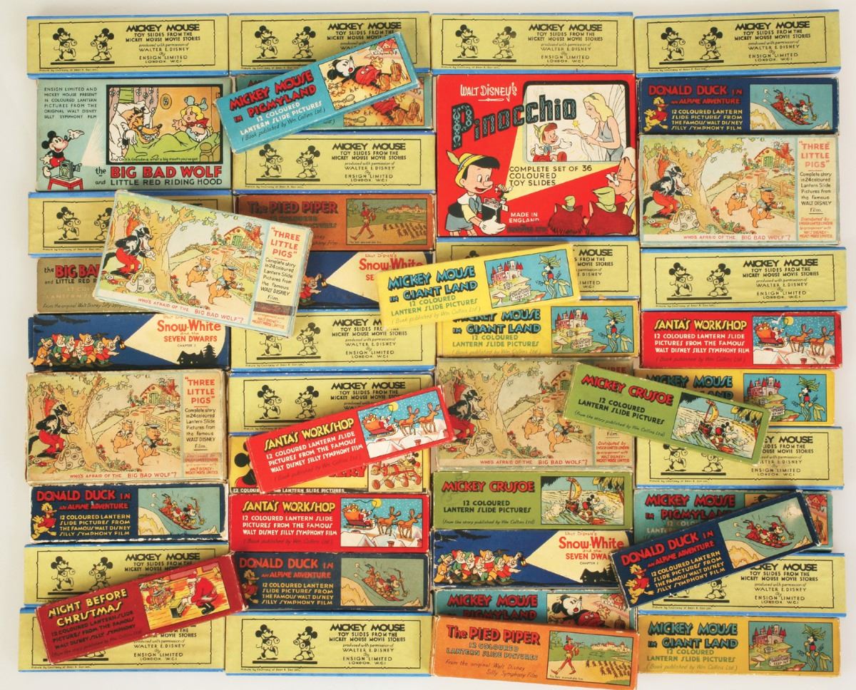 (1930s) Collection of (46) toy lantern slides from various productions including: "Mickey Mouse Cartoons", "The Big Bad Wolf", "Pinocchio", "Snow White", and more. Some duplicates, but at least (25) unique sets in this lot.