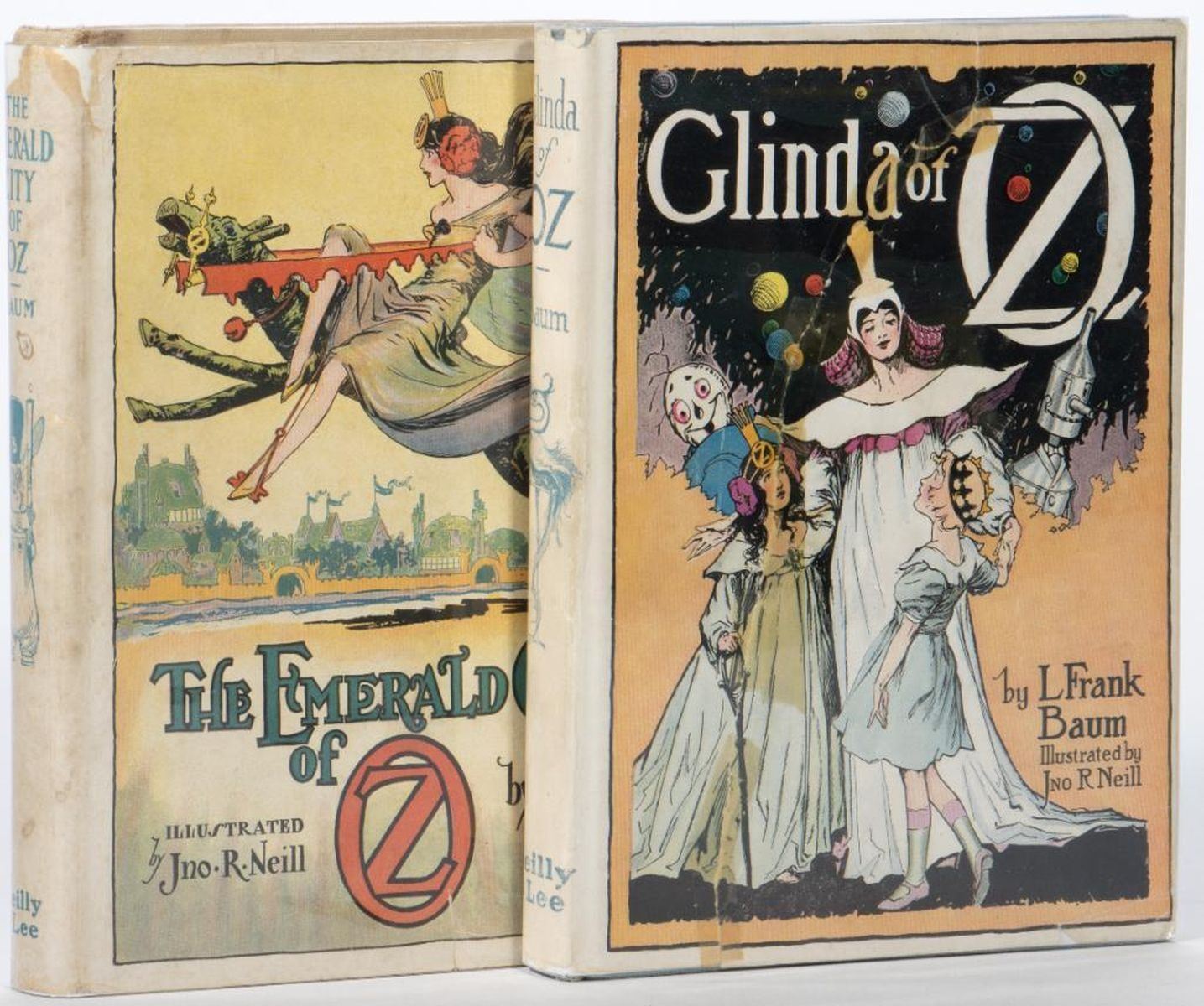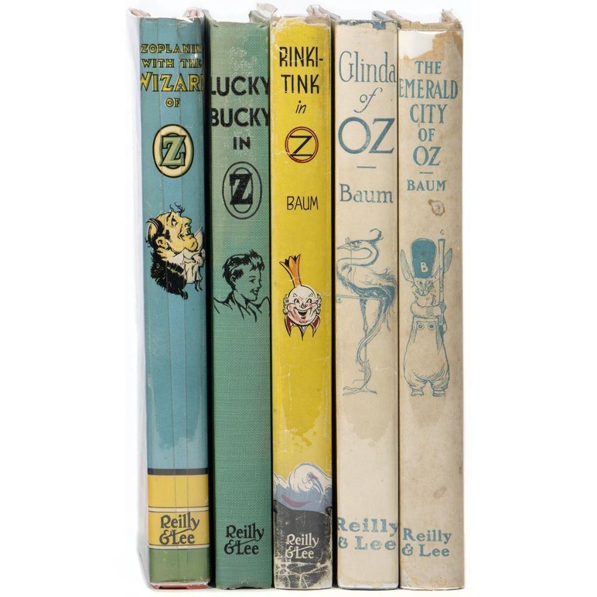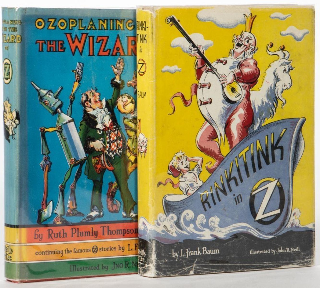 Collection of 5 1950's Oz books, with 4 in dust jackets. Ozoplaning with the Wizard of Oz by Ruth Plumly Thompson, illustrated by John R. Neill, with Neill dust jacket. Emerald City of Oz by L. Frank Baum, illustrated by John R. Neill, with Neill dust jacket. Glinda of Oz by L. Frank Baum, illustrated by John R. Neill, with Neill 15 dust jacket. Rinkitink in Oz by L. Frank Baum, illustrated by John R. Neill, with later variant Dick Martin color dust jacket. Lucky Bucky in Oz written and illustrated by John R. Neill. No color plates in books or on covers except for Emerald City of Oz has color cover. Very good volumes, edgewear to Rinkitink Jacket, large tape repaired tear on Glinda jacket, taped egdes on Ozoplaning jacket.
