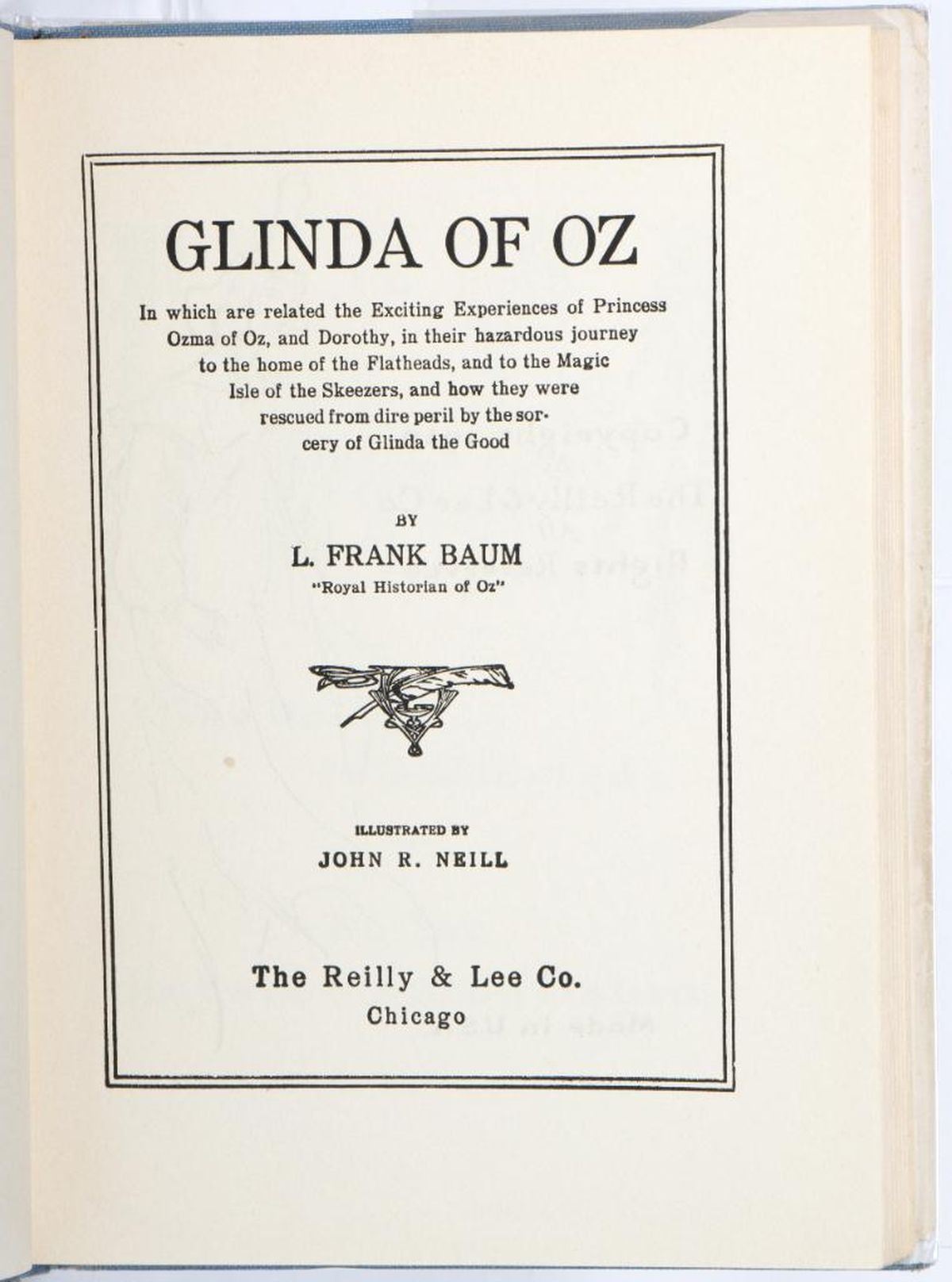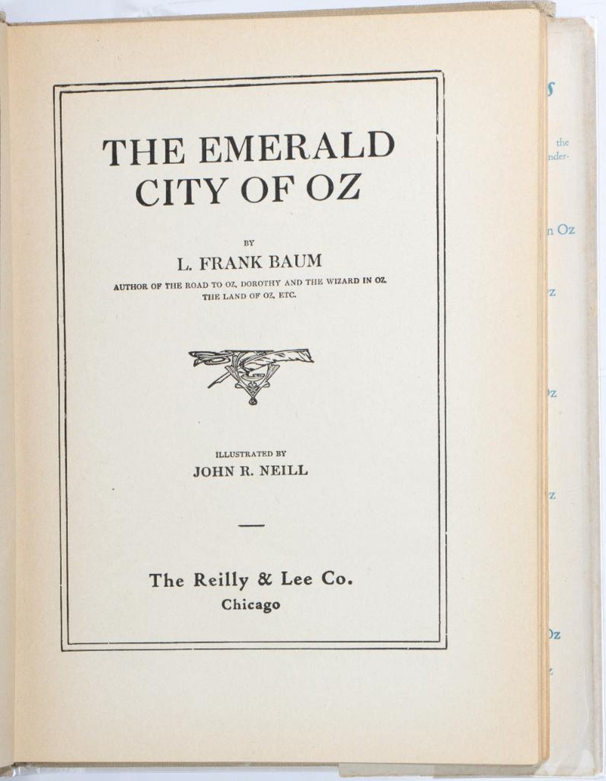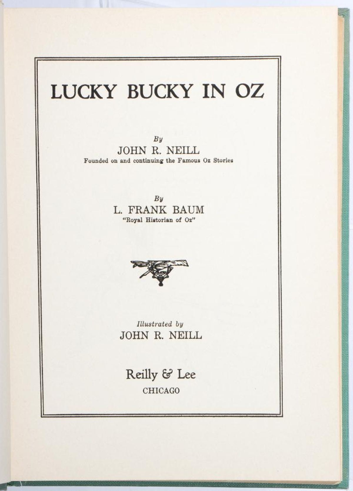 Collection of 5 1950's Oz books, with 4 in dust jackets. Ozoplaning with the Wizard of Oz by Ruth Plumly Thompson, illustrated by John R. Neill, with Neill dust jacket. Emerald City of Oz by L. Frank Baum, illustrated by John R. Neill, with Neill dust jacket. Glinda of Oz by L. Frank Baum, illustrated by John R. Neill, with Neill 15 dust jacket. Rinkitink in Oz by L. Frank Baum, illustrated by John R. Neill, with later variant Dick Martin color dust jacket. Lucky Bucky in Oz written and illustrated by John R. Neill. No color plates in books or on covers except for Emerald City of Oz has color cover. Very good volumes, edgewear to Rinkitink Jacket, large tape repaired tear on Glinda jacket, taped egdes on Ozoplaning jacket.