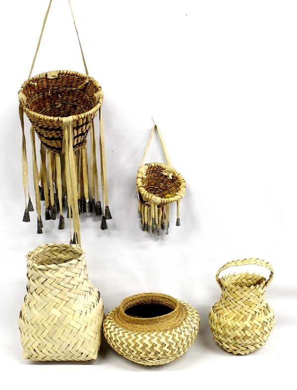 Collection of 5 Baskets, includes 3 Tarahumara and 2 Native American Apache Burden Baskets with tin jingles, largest measures 7'' x 5'' x 5''