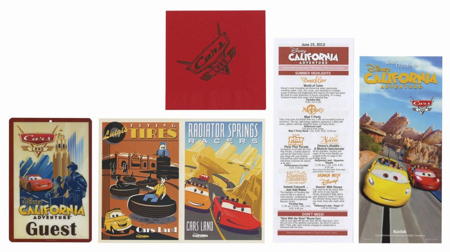 (California Adventure, 2012) A collection of (5) items from the grand opening event for Cars Land at Disney's California Adventure. Included is a park map, a daily events guide for June 15, a cocktail napkin featuring a Cars Land logo, a Cars Land Premiere Party map, and a grand opening guest pass. This pass was good for June 13-15, 2012, as the June 13 premiere of Cars Land took place alongside the official reopening and re-dedication of California Adventure on June 15. Ranging from the 4.75"x4.75" napkin to the 10"x4" events guide, the items are all in very good condition with minimal wear.