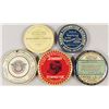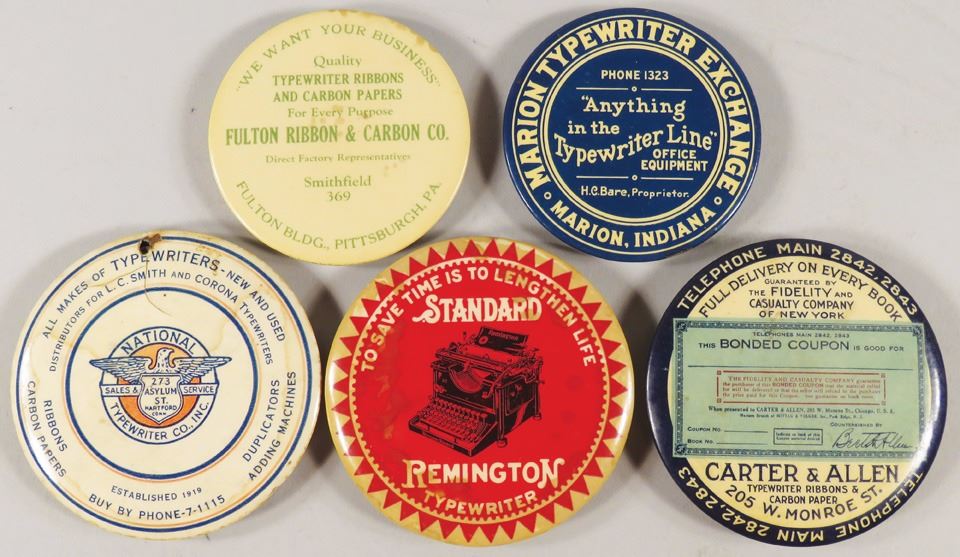 Collection of 5 Celluloid Advertising Pocket Mirror, Paperweights, typewriter related. Marion Typewriter Exchange, Standard Remington Typewriter, Carter & Allen Ribbons and Paper, National Typewriter Co., and Fulton Ribbon & Carbon Co. Some staining and hole in National. Larger mirrors measure 3 1/2 inch diameter.