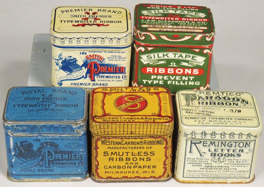 Collection of 5 Early Typewriter Ribbon Tins. Smutless Ribbons, Royal Brand, Premier Brand, Silk Tape and Paragon Ribbon. Royal Brand has some slight edgewear otherwise overall very good condition. 2 X 1 3/4 X 1 1/2 inches.