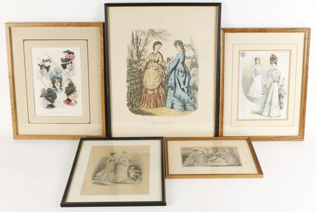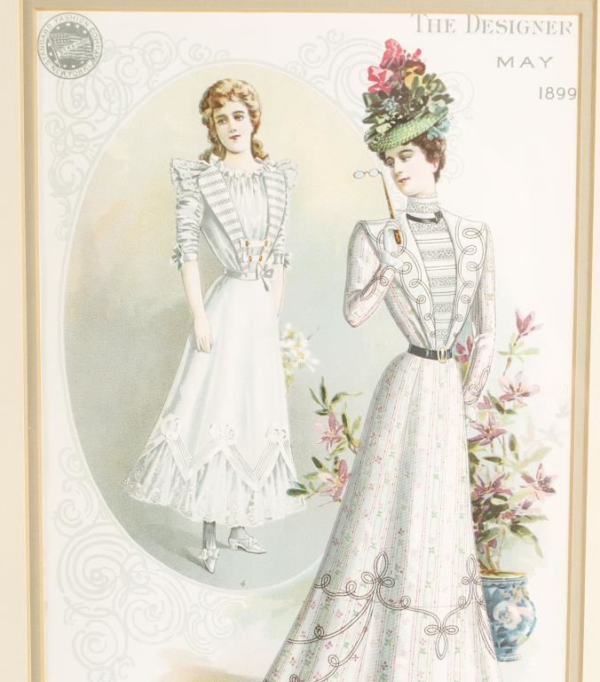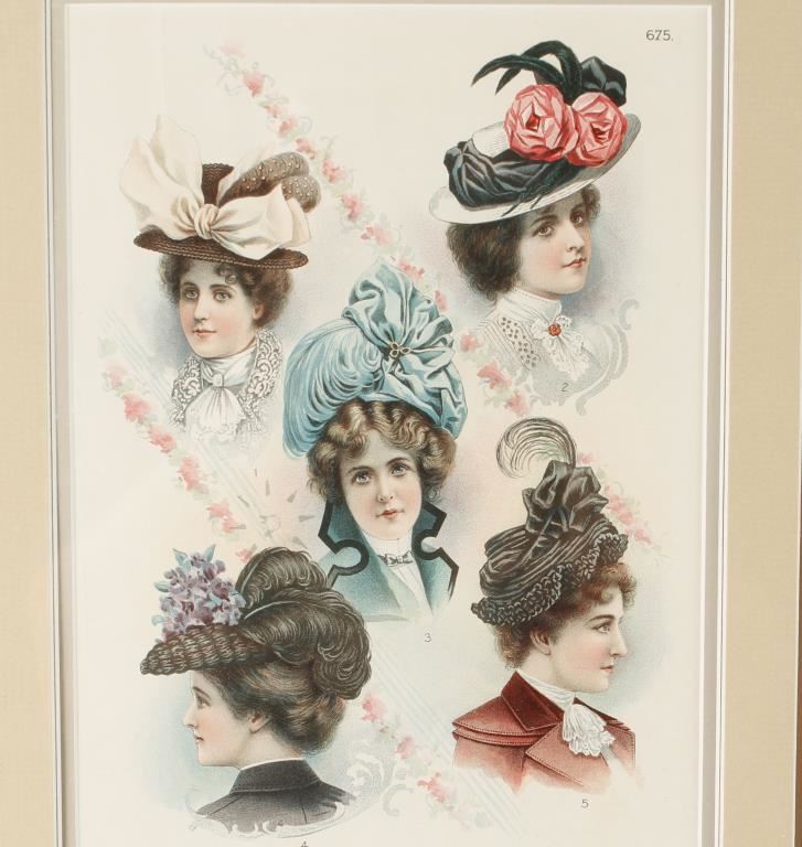 All depict ladies modeling fancy dresses and hats. Two of which are French advertisers, all nicely framed, very collectable, and are great boudoir decorators.