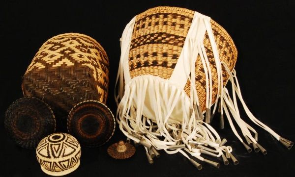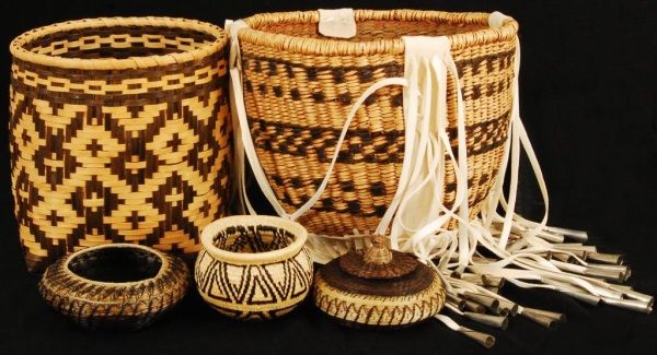 Cherokee Indian Basket, 8" W x 8-3/4" H. Certified by the Department of Interior as White oak planter basket woven by Carol Welch of the Cherokee Tribe; Navajo Indian Burden Basket, 11-3/4" D x 9" H.; 2 Horse Hair Indian Baskets, One with lid. Larger measures 5 1/2" diameter.