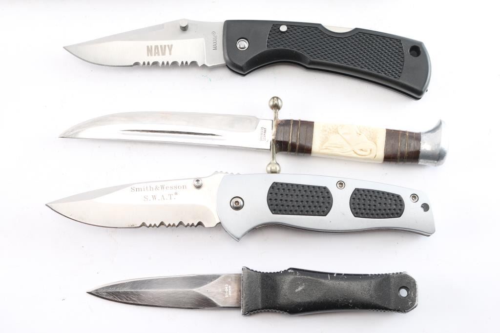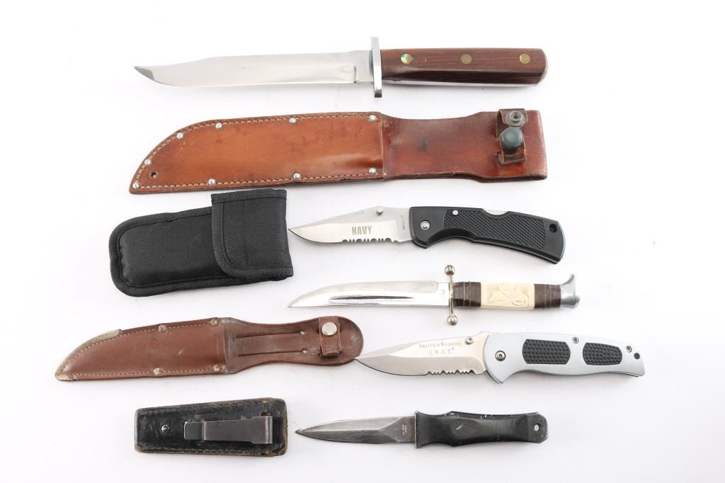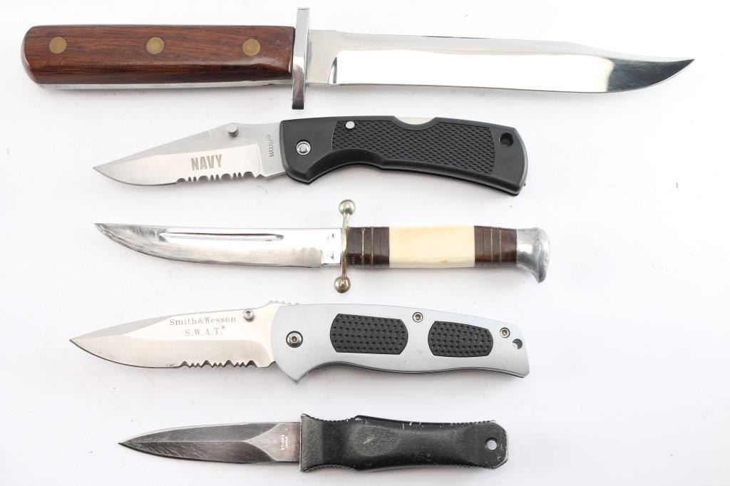 Includes: (1) S&W SWAT folding knife w/ 3.75" blade, 8.5" overall, aluminum body w/rubber inserts and pocket clip. (1) MAXAM folding knife w/ "NAVY" etched on the clip point blade w/ serrations, black plastic handle, made in China w/ nylon sheath. (1) Explorer MM-1 dagger, 3.5" blade, 7.25" overall w/ leather sheath w/ pocket clip. (1) fixed blade knife w/ 4.5" blade, 8.75" overall, marked "Stainless Germany", w/ lion carved in faux ivory handle and leather wrap, w/ leather sheath. (1) fixed blade unmarked knife w/ 7" blade, 13.25" overall w/ wood grip w/ 3 brass rivets and leather sheath.