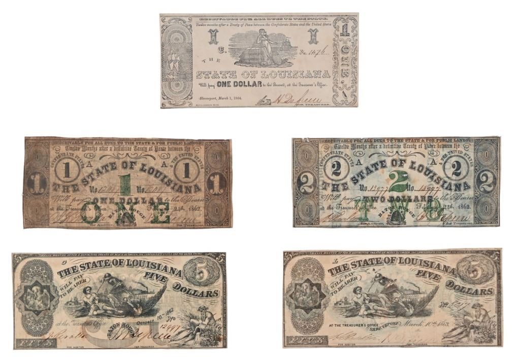 1862 State of Louisiana - $1, $2 and $5. 1863 - $5 and 1864 - $1.