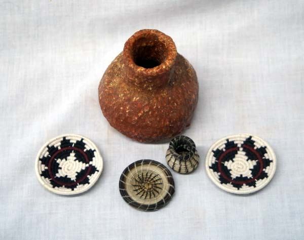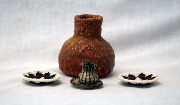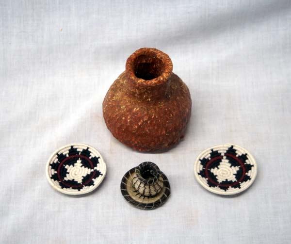 Collection of 5 Miniature Native American Baskets, largest measures 3'' x 3'', includes an Apache Tus, Tohono O'odham Horsehair, and 2 Navajo tightly woven tri-colored basketry trays, beautiful collection