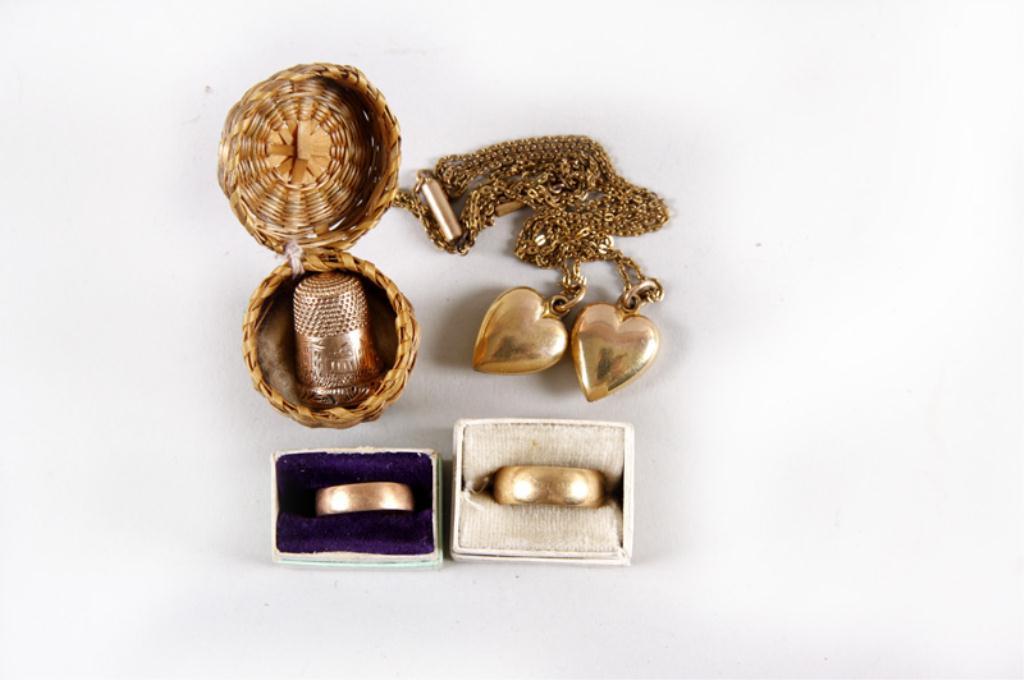 Collection of 5 Miscellaneous Items Consisting of 2 wedding bands, 1 is 14K and size 3; and 1 is 18K and size 5; what appears to be a gold or gold plated thimble "Alice Jan 25, 1872"; and with 2 heart shaped pendants which also appear to be gold.Consisting of 2 wedding bands, 1 is 14K and size 3; and 1 is 18K and size 5; what appears to be a gold or gold plated thimble "Alice Jan 25, 1872"; and with 2 heart shaped pendants which also appear to be gold.