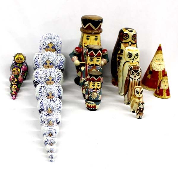 Collection of 5 Vintage Nesting Dolls, includes Drummers, Owls, Russian Matryoshka Dolls (Large & Small Set), and Old Santa Set, largest measures 7''H x 4''W