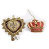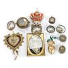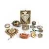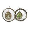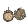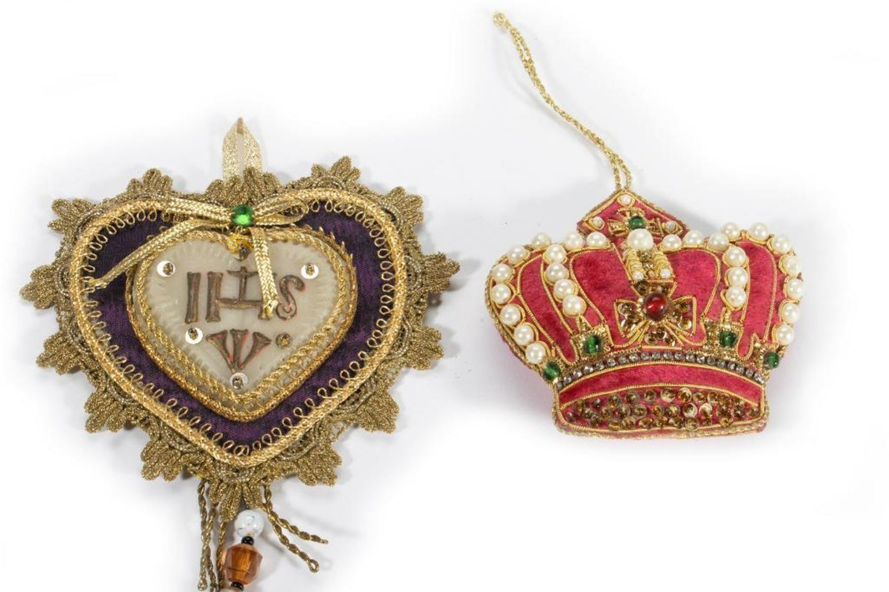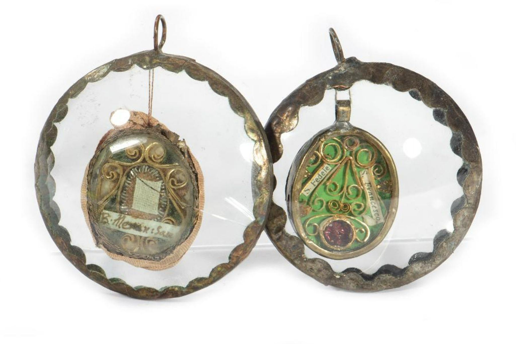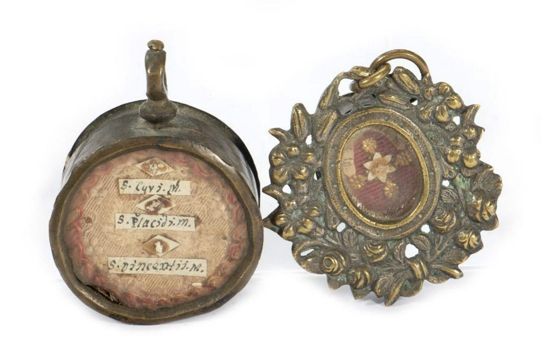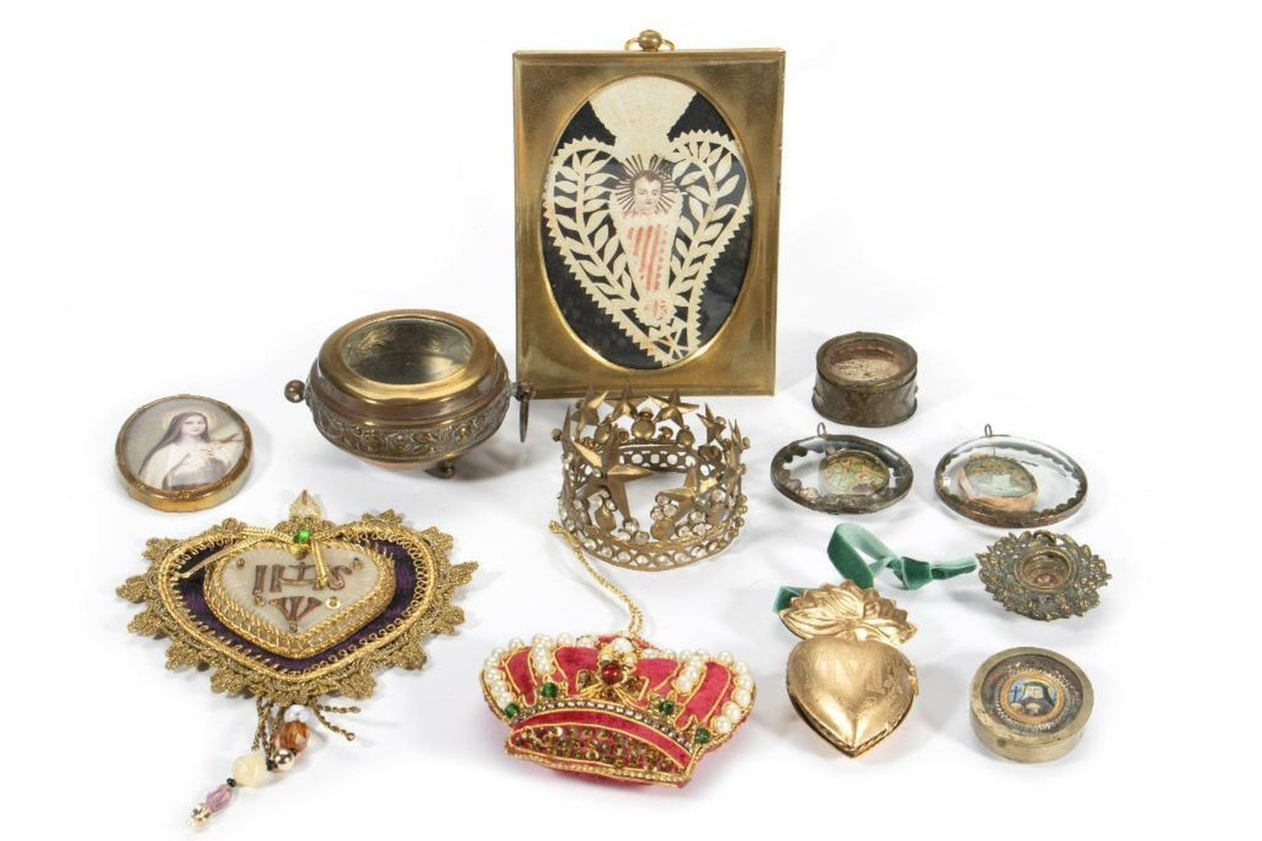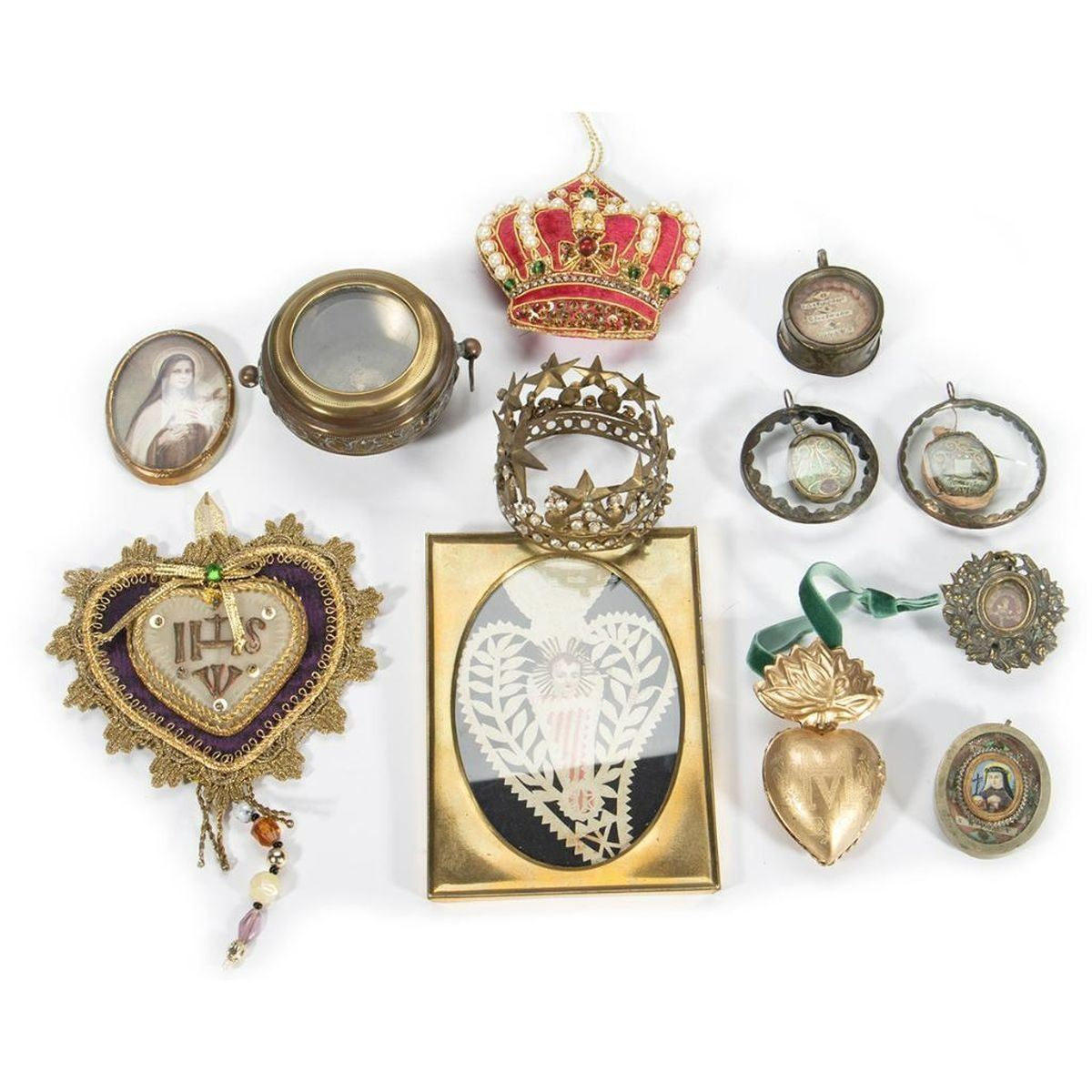 The five thecas range in overall size from 1 3/4in. to 2in.; one has a red wax stamp on the back; one is two-sided with three relics on each side. Together with an empty brass relic box (3in. diam.), a French copper-framed Virgin souvenir, a framed Victorian paper lace of Infant, a metal crown, and misc. contemporary ornaments.