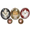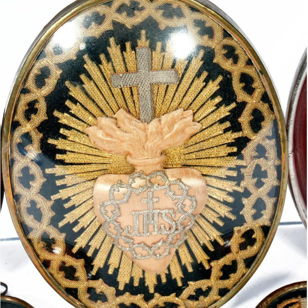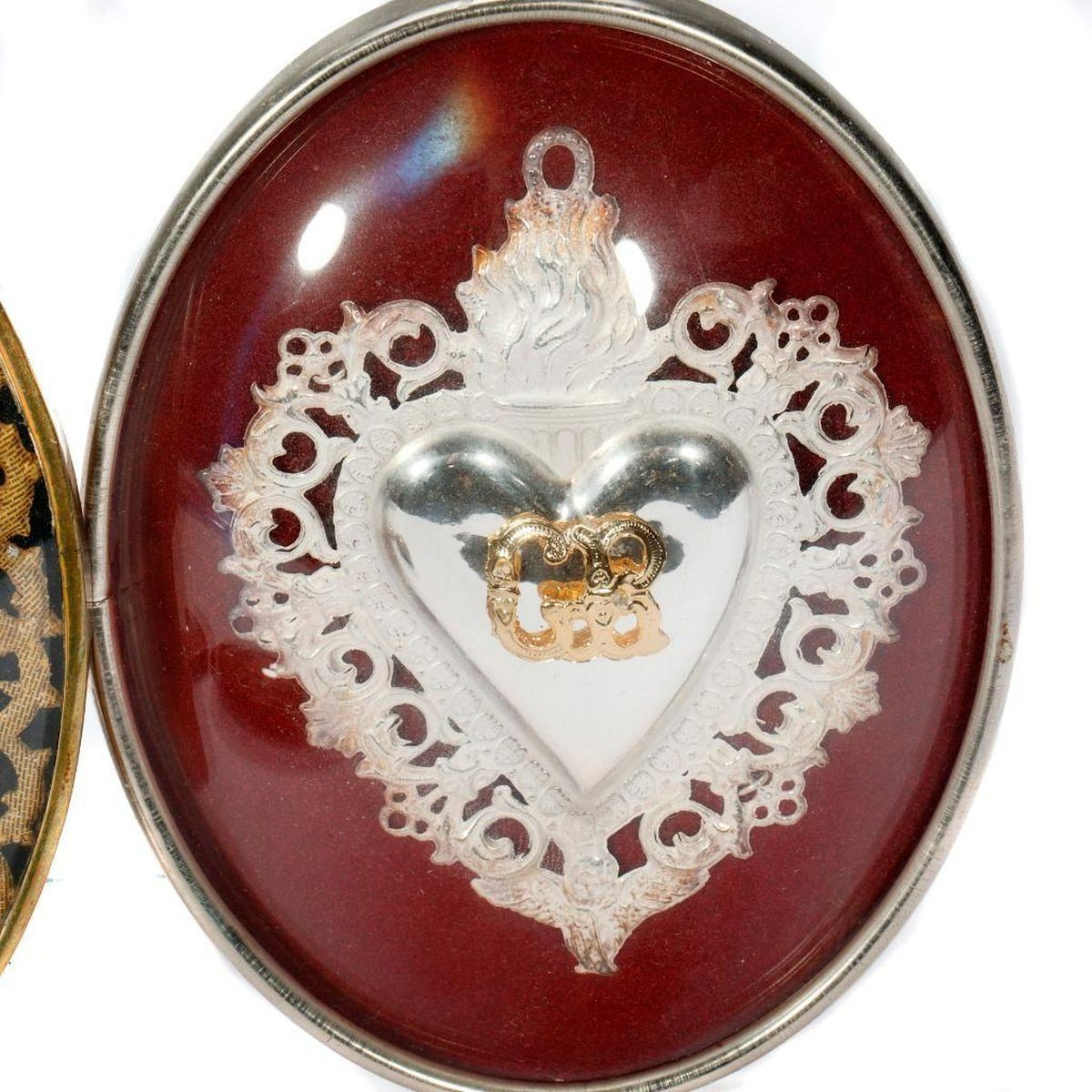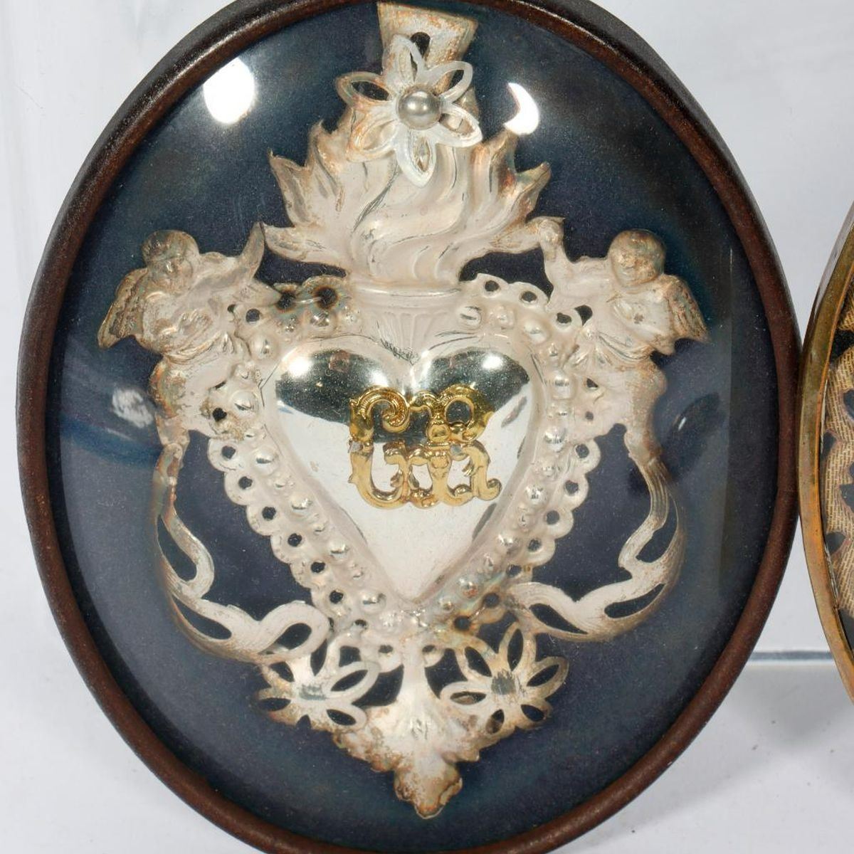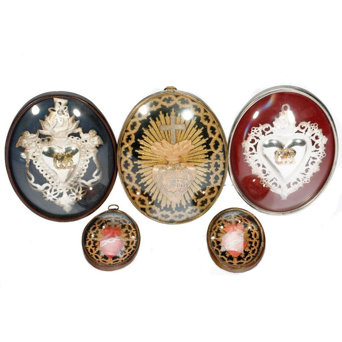 Comprised of metal and cloth hearts in domed glass frames. One marked on back: "L M & C / France." Ranging from 2 1/2in. to 5in. long.