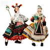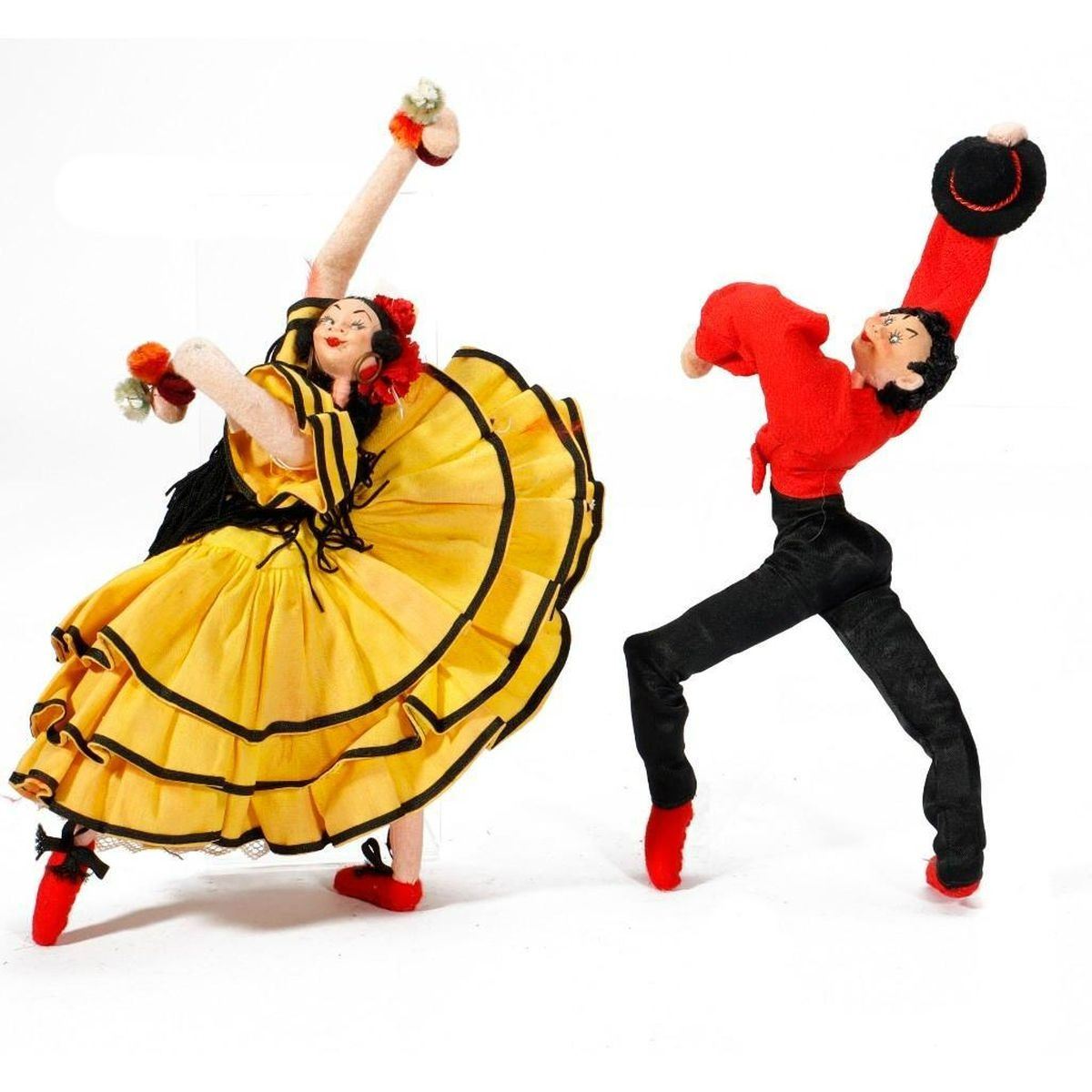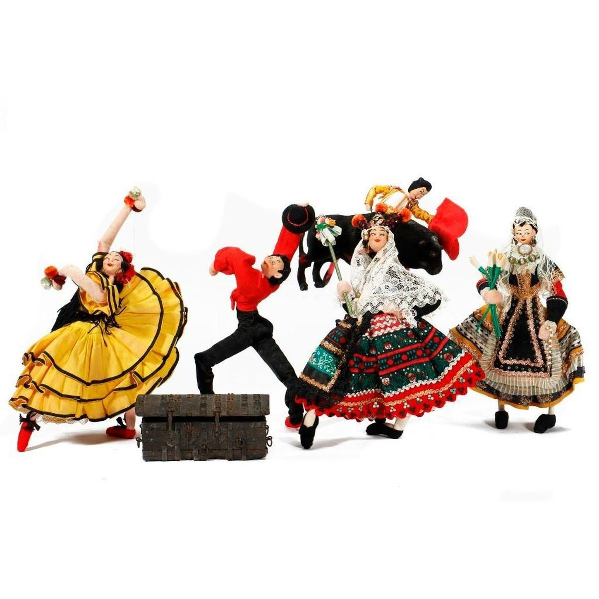 The characters depicting male and female flamenco dancers, two women in festival/folk costumes, and a bullfighter with flocked plastic bull. Together with a Spanish souvenir miniature metal-banded wood chest "Cofre de el Cid" (2in. x 4 1/2in. x 2 1/4in.). Ranging in height from 5 1/2in. to 10 1/2in. All in good condition; some wear to the flocking on bull.