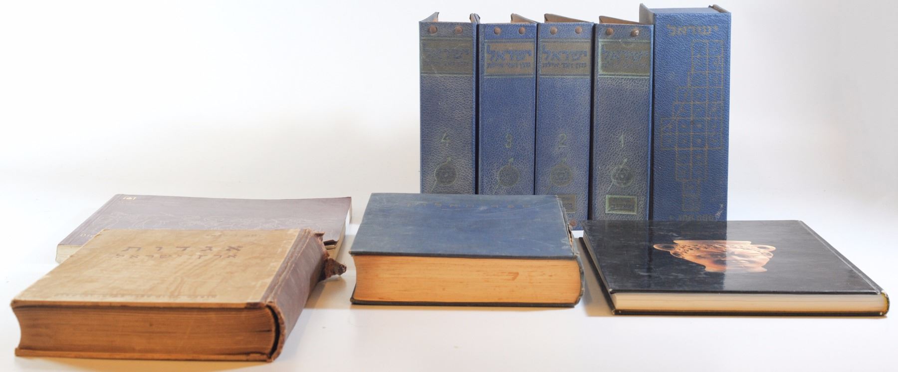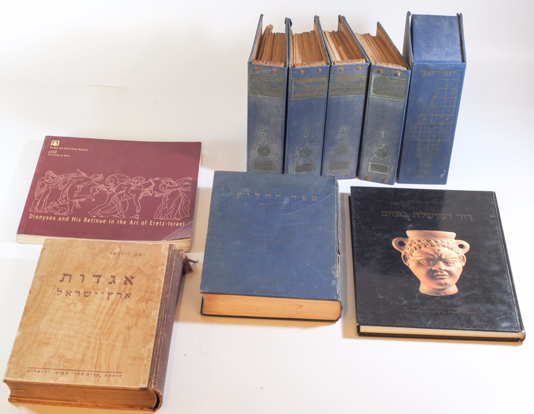 Collection of 5 books on the Land of Israel + MiDan vead Eilat set: 1. Dionysus and his entourage in the art of the Land of Israel, published by the Reuven and Edith Hecht Museum in collaboration with the University of Haifa, catalog No. 14, 1999 2. Dor Hamoshelet Bayamim/Ephraim Stern: ten years of archeological digging at the Israel-Phoenician Port in Hof HaCarmel, with dedication by the author, published by the Bialik Institute and the Israel Exploration Society, 1992, 3. Legends of the Land of Israel / Zeev Vilnai, Kiryat Sefer Publishing Ltd., Jerusalem, 1950, 5. Sefer HeChalutz 1939-1989, anthology edited by Moshe Basok, published by the Jewish Agency - Department of Aliyah, Jerusalem, 1940. In addition, a set of Israel from Dan to Eilat, Ma'ariv Library, volumes 1-4, and a selection of maps 1: 10000. Missing volume 5. Variable conditions: timeworn, especially bindings, interior and good condition, the old books are slightly yellowing.