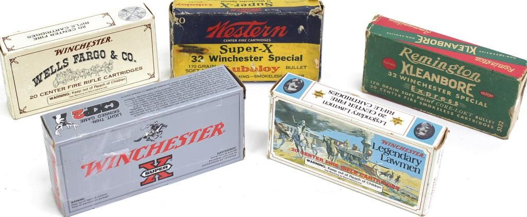 Collection of 5 boxes of ammo includes Winchester Well Fargo & Co 30-30 , Western Super-X 32 Win Special, Remington Kleanbore 32 Win Special, Winchester 32 Win Special and Legendary Lawmen 30-30. All full correct except the Remington Kleanbore which is mincludes Winchester Well Fargo & Co 30-30 , Western Super-X 32 Win Special, Remington Kleanbore 32 Win Special, Winchester 32 Win Special and Legendary Lawmen 30-30. All full correct except the Remington Kleanbore which