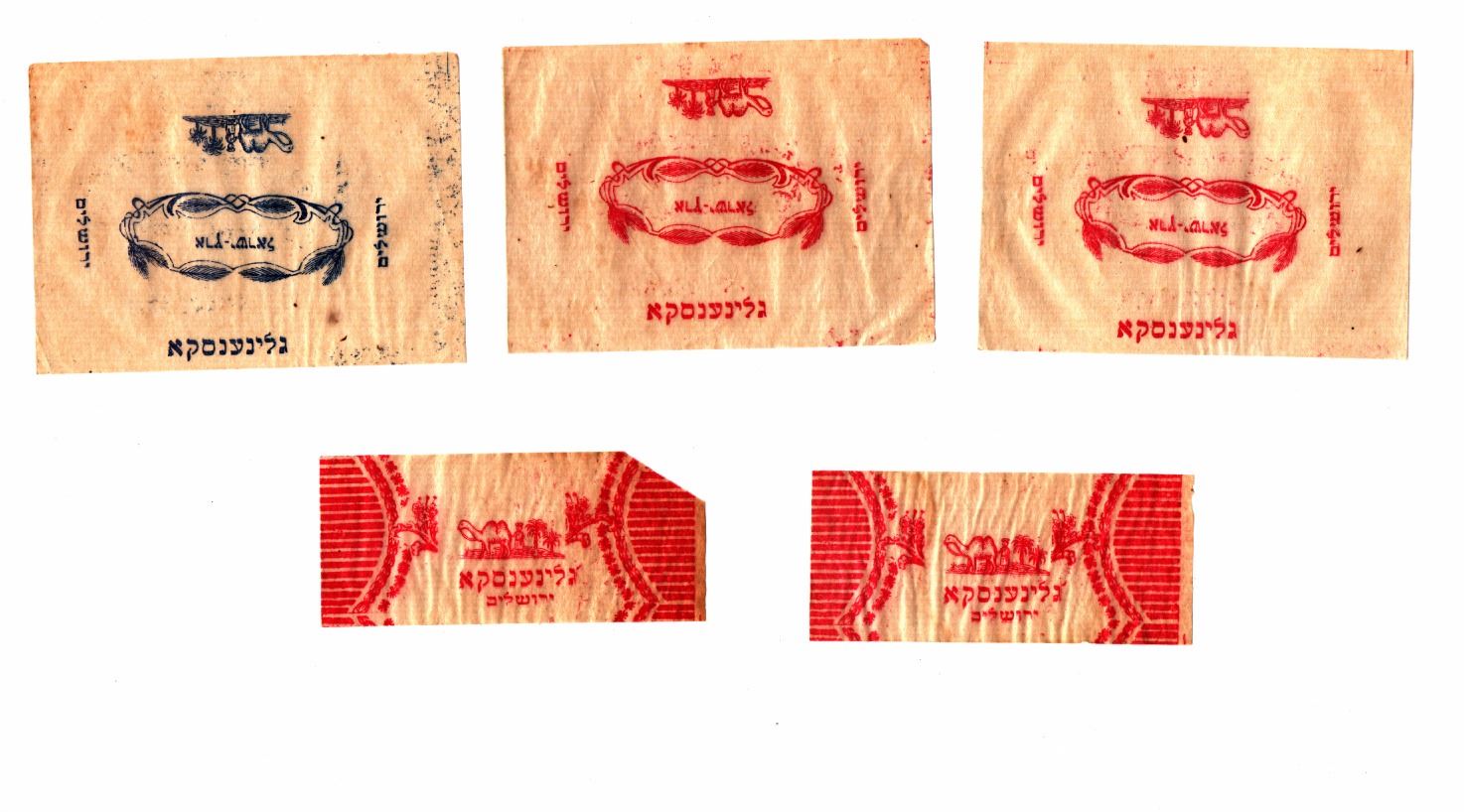 Collection of 5 candy paper wrappers , Mandatory Palestine, Glinenska company, overall in good-very good conditions, the right top corner is missing from one of the wrappers.