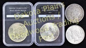 includes 2 slabbed and uncirculated silver peace dollars 1922 and 1924, ungraded 1922 and 1923 and 1942 half dollar liberty. Est. 75-150