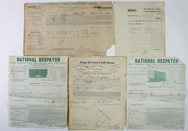 City Marshall Council Bluffs IA, Chicago, Rock Island and Pacific Railroad 1877, 2 National Dispatch 1877 & 1878, California Fast Freight Line 1878. Est. 25-75