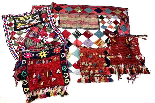 2 Uzbek apron fronts, Uzbek hanging wall pocket, and 2 wall hangings. Est. 150-300