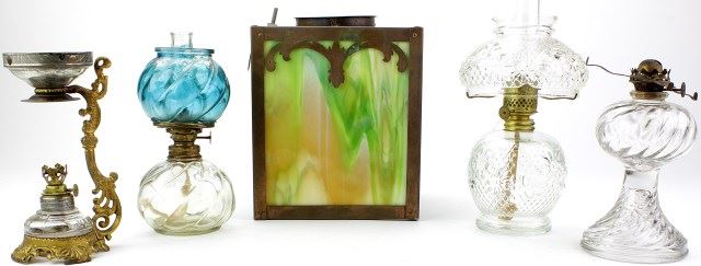 Cresolene vapor lantern and green slag glass shade. Est. 125-200