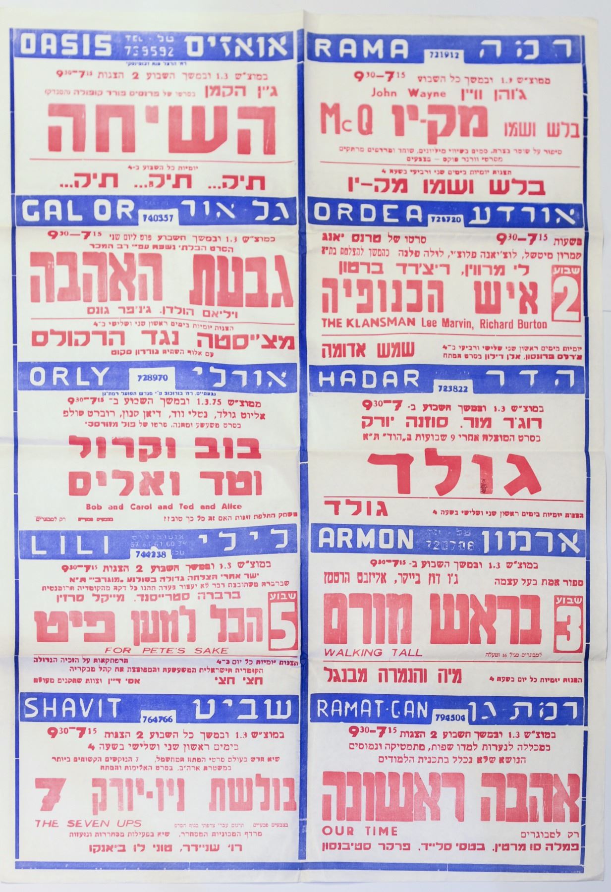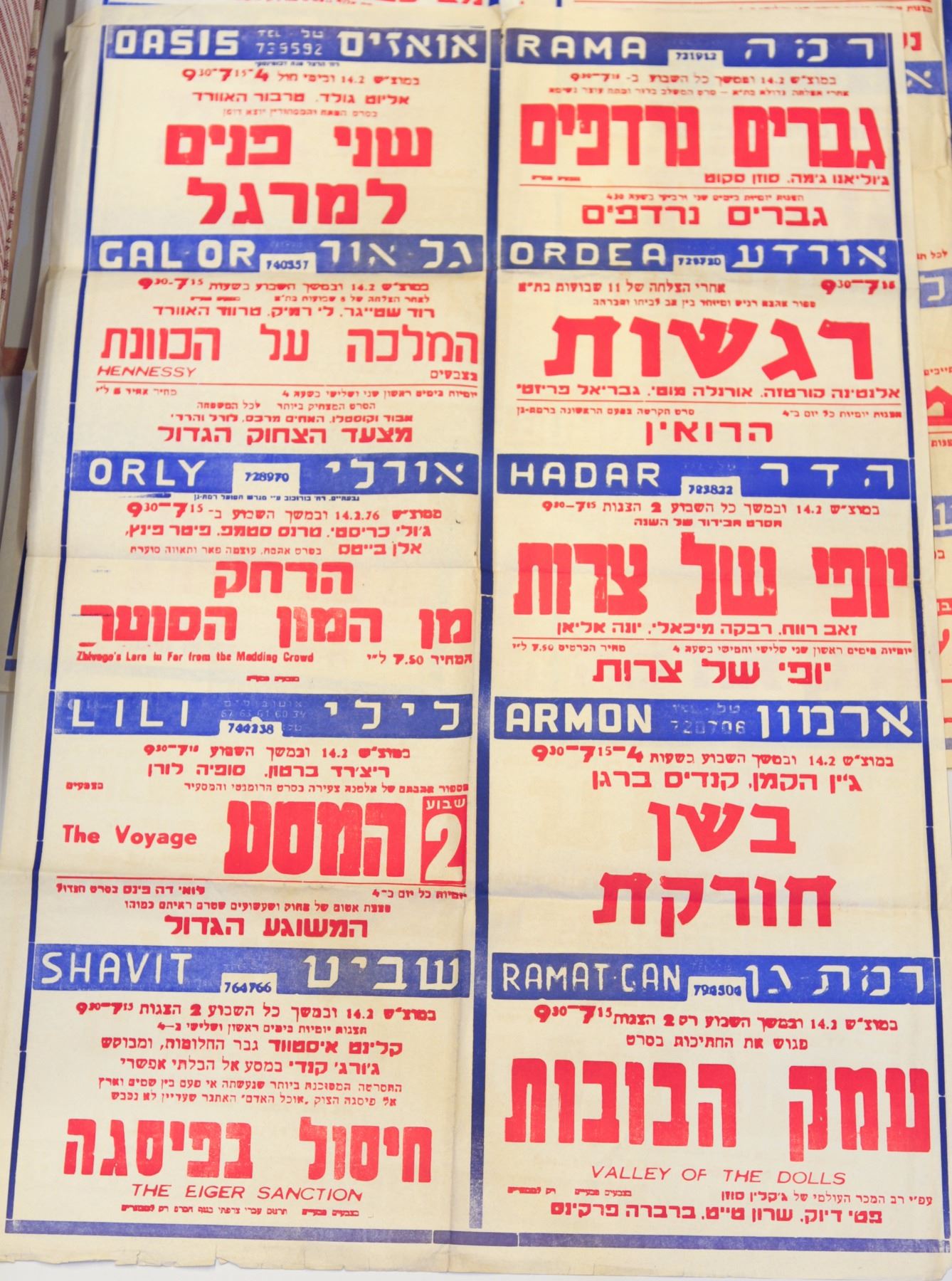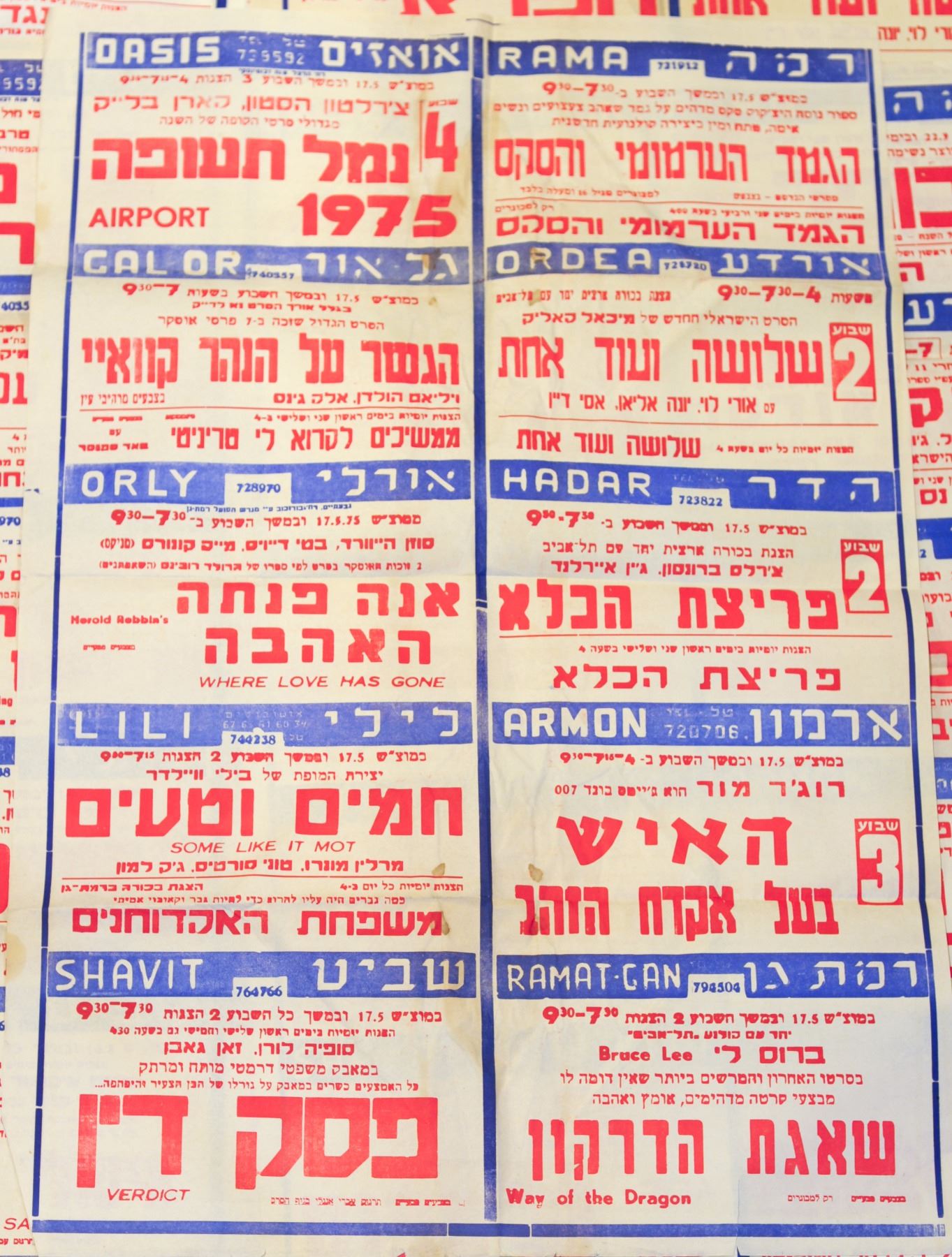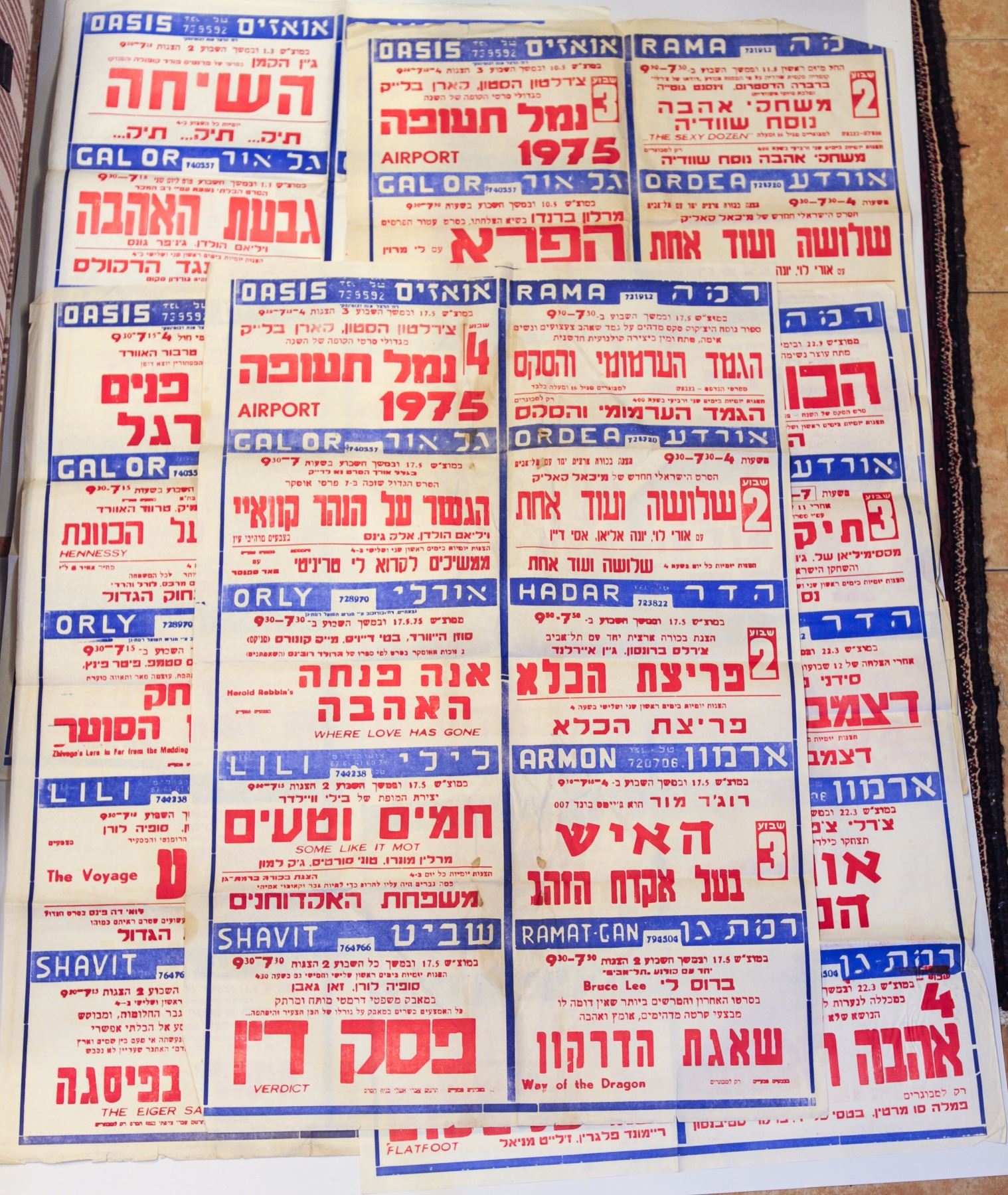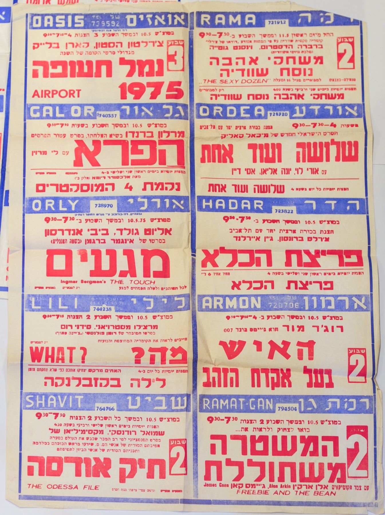Collection of 5 movie screening posters, in various cinemas across Gush Dan, Nesher Print, Matalon St. Tel Aviv, 1979. Good condition: margins slightly torn, folding marks., 2 has got yellowing, Dimensions: 63x95 cm.