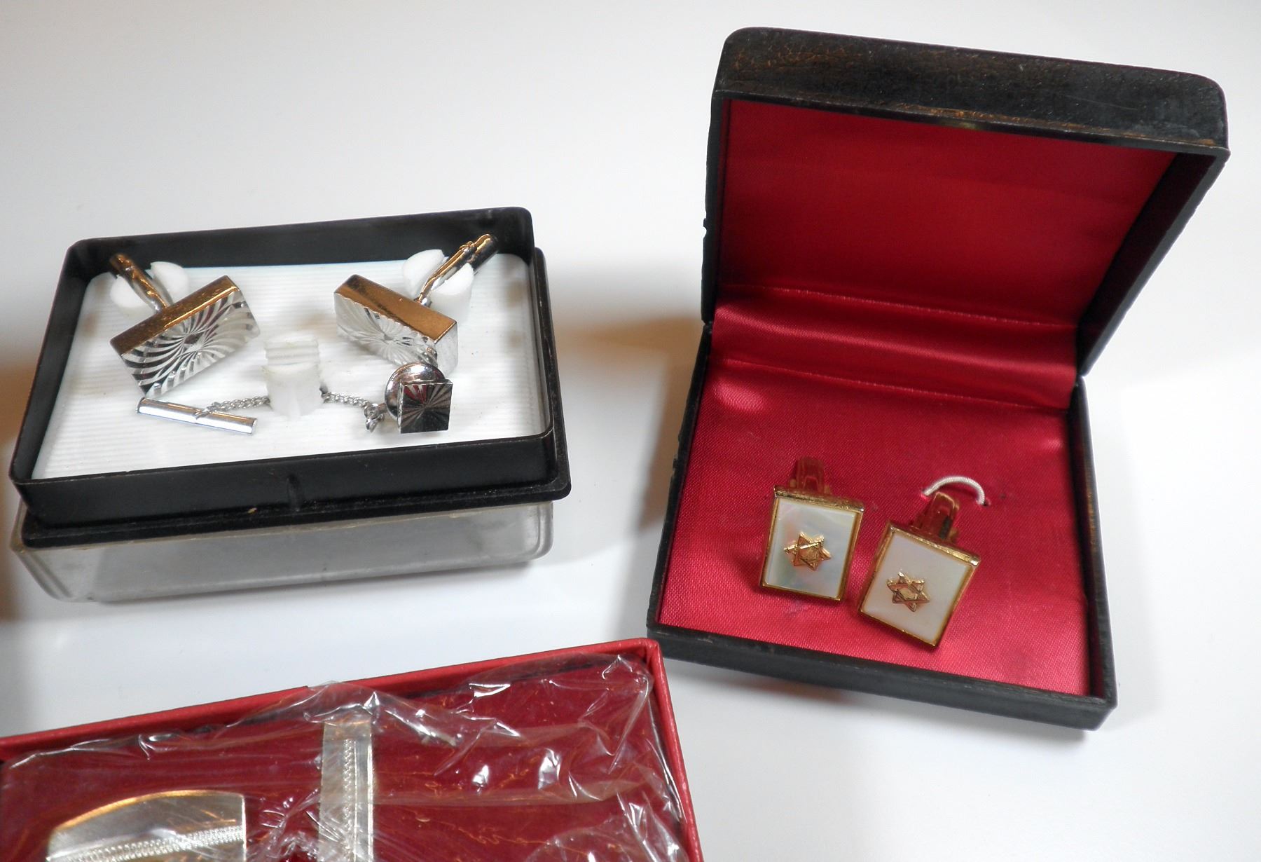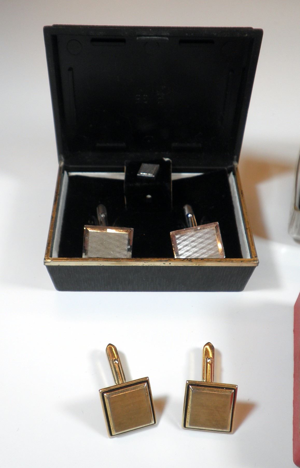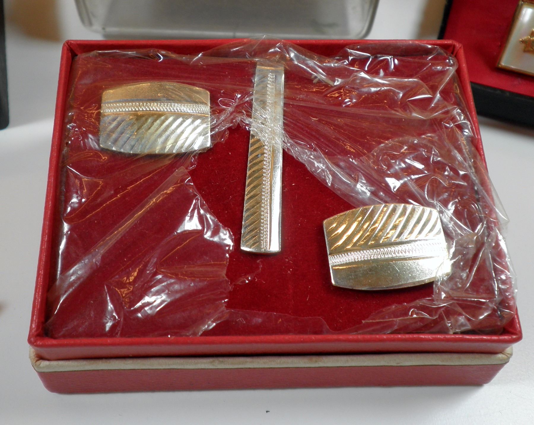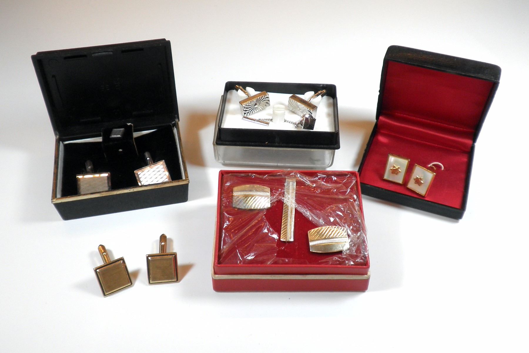 Collection of 5 sets of cufflinks, one is made of 925 sterling silver and includes a tie pin, 4 sets come in original cases.