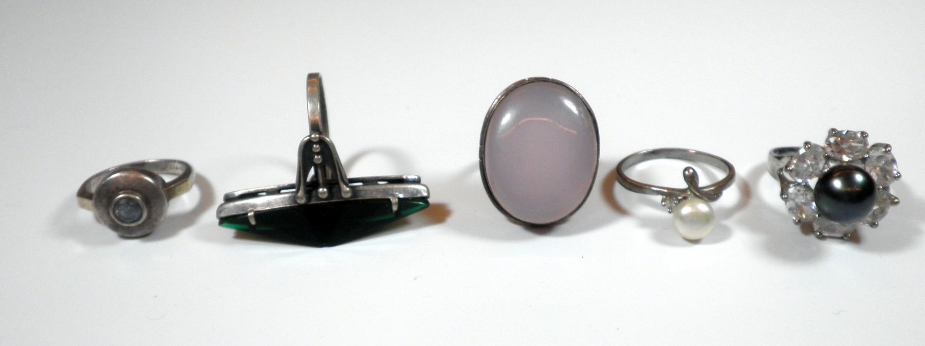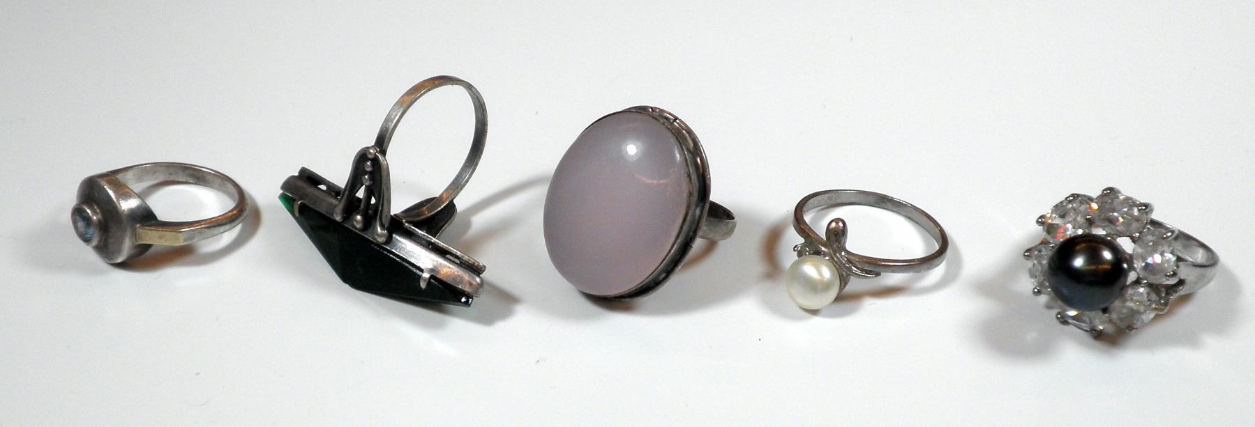Collection of 5 vintage rings with gemstone settings, 4 of which are 925 sterling silver, and one has a white 18K gold plating. Sizes 7-9, total weight: 27.5 gm.