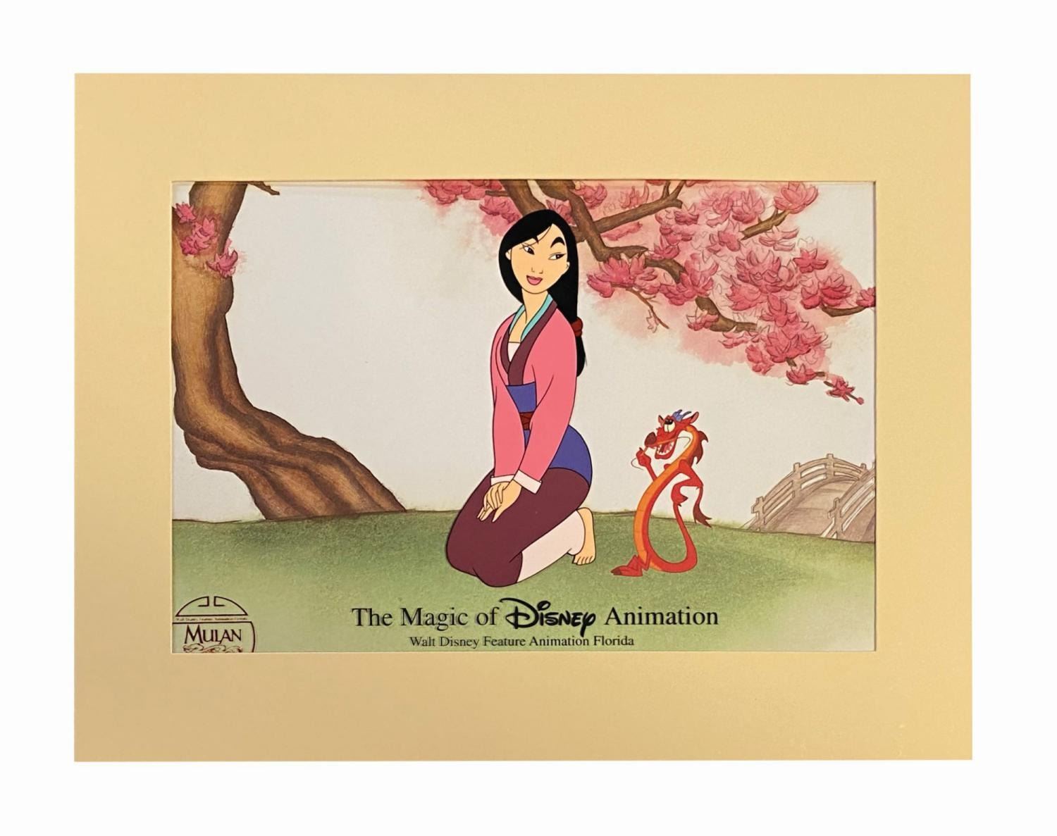 (Disney-MGM, 1991-2015) A large collection of (50) hand-painted cels sold at the Animation Gallery at Disney's Hollywood Studios. The Animation Gallery sold cels, other artwork, and more, until it closed in 2015. This massive collection includes (50) different cels featuring a variety of characters, mostly Mickey & Friends, but also familiar characters from Disney's animated features. Notably, the popular Tarzan and Mulan cels are included, which were released the same year as the films. Each cel comes with a custom printed background, and fits into a hinged mat folder. While the line work is pre-printed, each cel has been hand-colored. Most have a seal with the year of production and the cel title. A total of 29 cels come with their original CoA, which list edition sizes ranging from 100 to 2000. All the cels measure 10.5"x13" in their 11"x14" display folders, except the earliest cel which is in a 12"x15" folder. The cels are in very good condition. Eight of the cels show minor wear on the background where the cel was stuck to the image, and seven of the cels are still stuck to the backgrounds. A few of the mat folders show light edge-wear, and two cels come with their original receipt. All are in their original packaging.