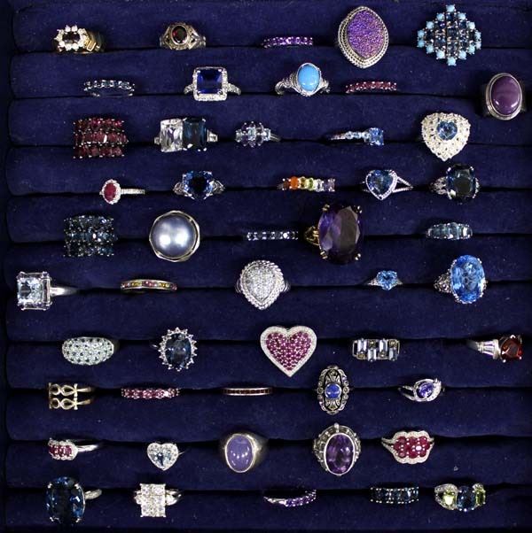 Collection of 50 Gemstone Rings in display box, most are sterling, largest measures 1''L, includes amethyst, turquoise, ruby, topaz, druzy, garnet, peridot, and more, rings vary in sizes